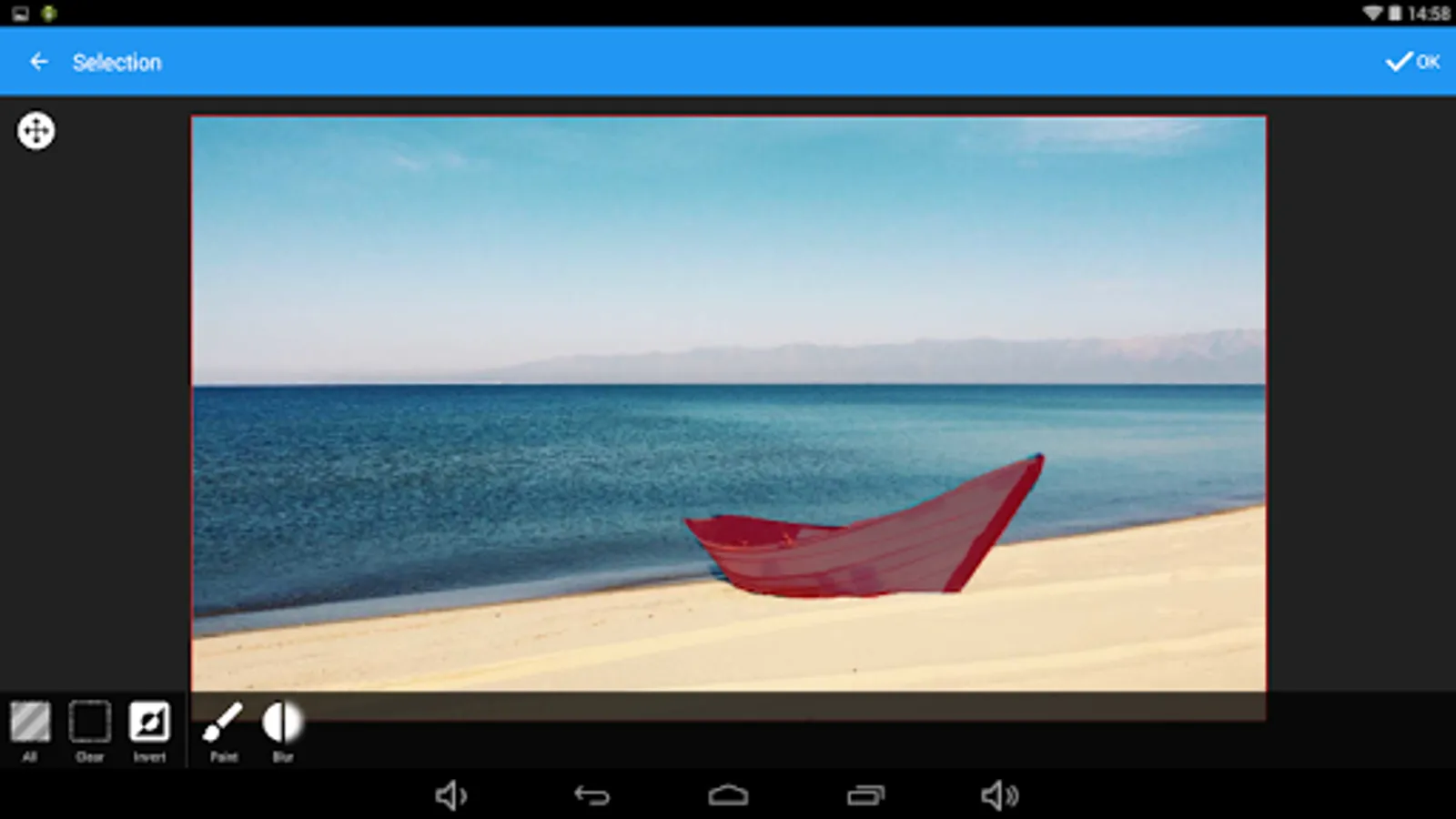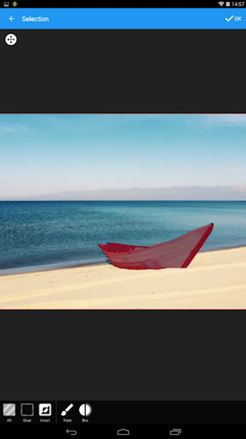 ➤ SELECTION masks: Select by manual drawing with your finger and/or magic wand tool, get reverse selection, blur, expand or contract. Then the selection will allow you to duplicate layers matching only the selected areas and apply settings (brightness, saturation, ...) in a layer but only to your selection.