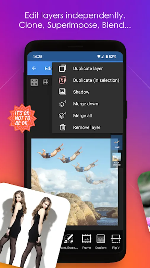 This app is able to do any photo editing action: edit each layer independently, superimpose layers, blend modes, background eraser with transparency, magic wand to select and edit eye color, red eye, whitening, ..., create amazing effects such as flip and superimpose a mirror image, create collages, watermark overlay, ...