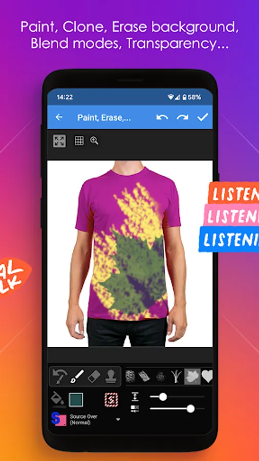 ➤ Layers: move, scale/zoom and rotate, with simple finger gestures. Switch lock & visibility. Set transparency, crop layers, horizontal/vertical flip, perspective, shadow layers, duplicate, merge layers, combine (flatten)...