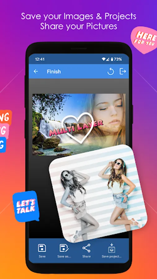 Edited pictures may be shared and saved as PNG files (supports transparency) and also as standalone projects (.multilayerphoto). It integrates a file explorer able to load&save pictures locally or even in your Local Network (WiFi LAN).