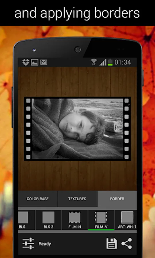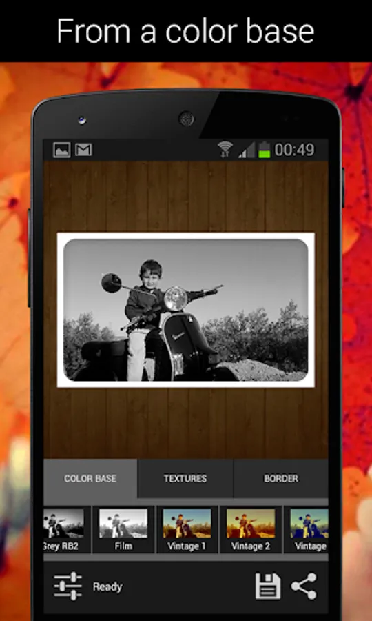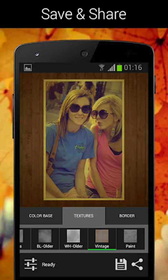 Customize your photos combining one of several gorgeous color filters with one or more overlayed textures and any of the beautiful borders.