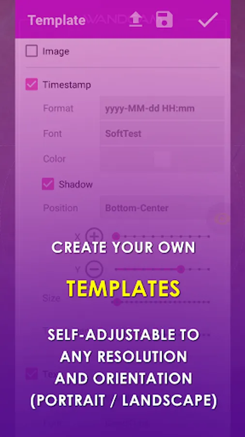 This camera app allows to customize templates with overlays and use them to print over the pictures. You can add timestamps, texts, images (e.g.: your company's logo) and design patterns such as color gradients, frames, bars, lines, vignete effects...