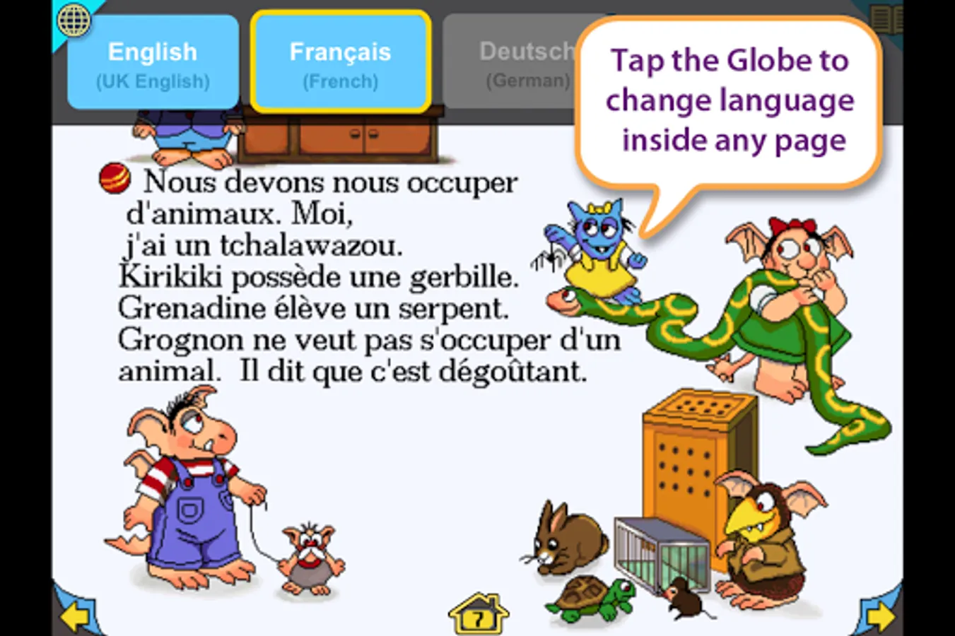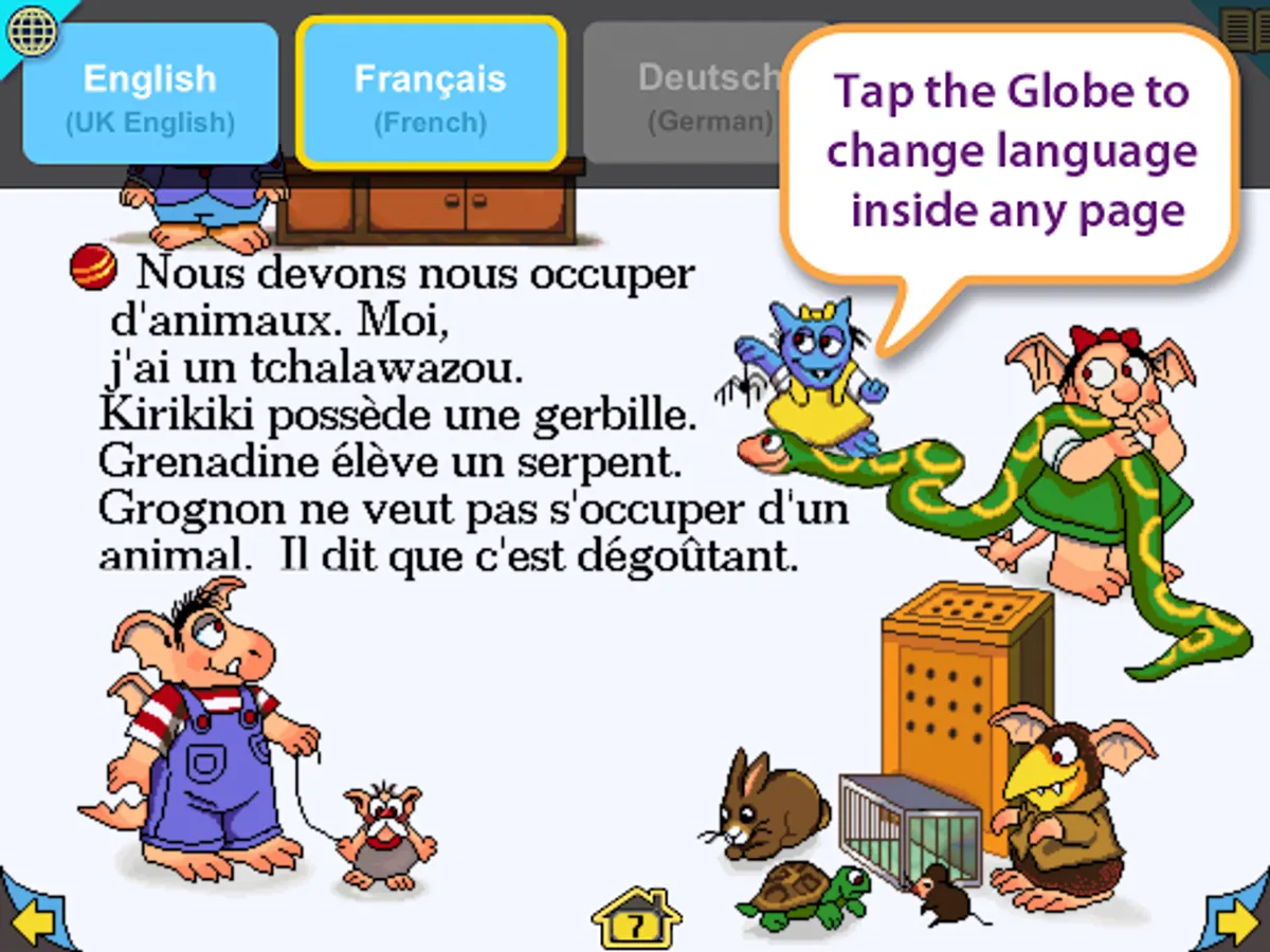 • Interactive storybook content in UK English (all characters have a British accent) and French