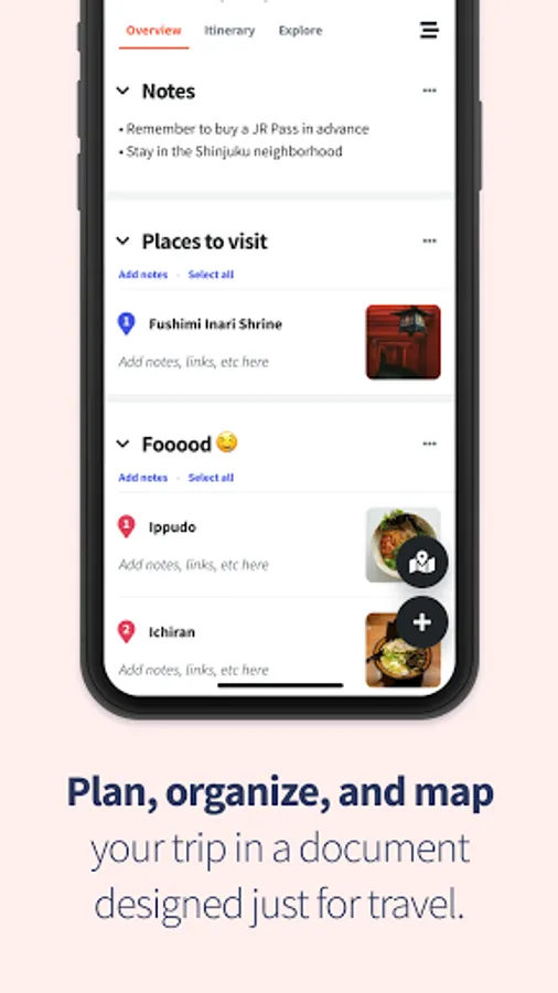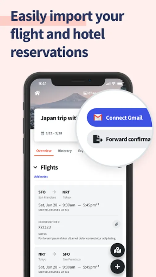 Access flights, hotels, and attractions in one app. Forward flight and hotel confirmation emails to import them directly into your trip plan, or connect your Gmail to automatically add them. Prefer to keep high-level plans? Make generic lists like βThings to doβ and βRestaurantsβ you want to eat at. Traveling on a tight schedule and want to create a detailed itinerary? Organize your day by adding start (and end) times, perfect for keeping track of tickets and reservations.