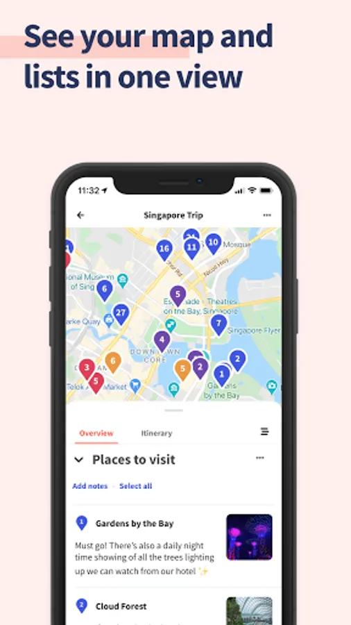 Every time you add a place to visit, itβs immediately pinned on your Google Maps-based travel map. No need to pull up different travel apps and websites to organize vacation plans - you can do it all in the Wanderlog trip planner app! Plus, if youβre visiting points in order, lines will connect the different pins on the map so you can see your route (perfect for road trips!). You can also export all your places to Google Maps too.