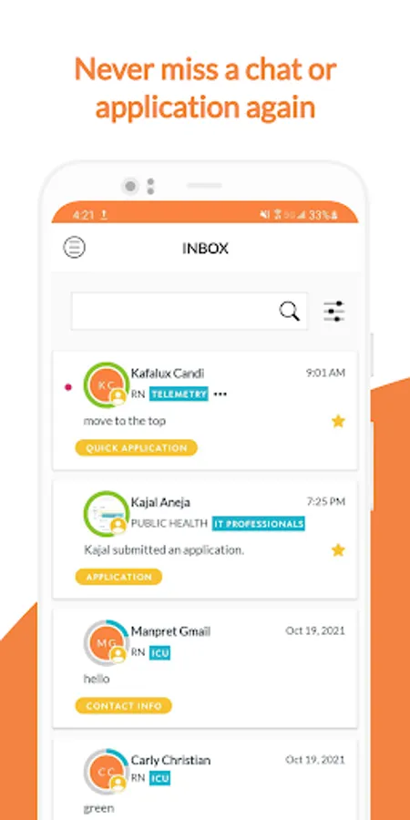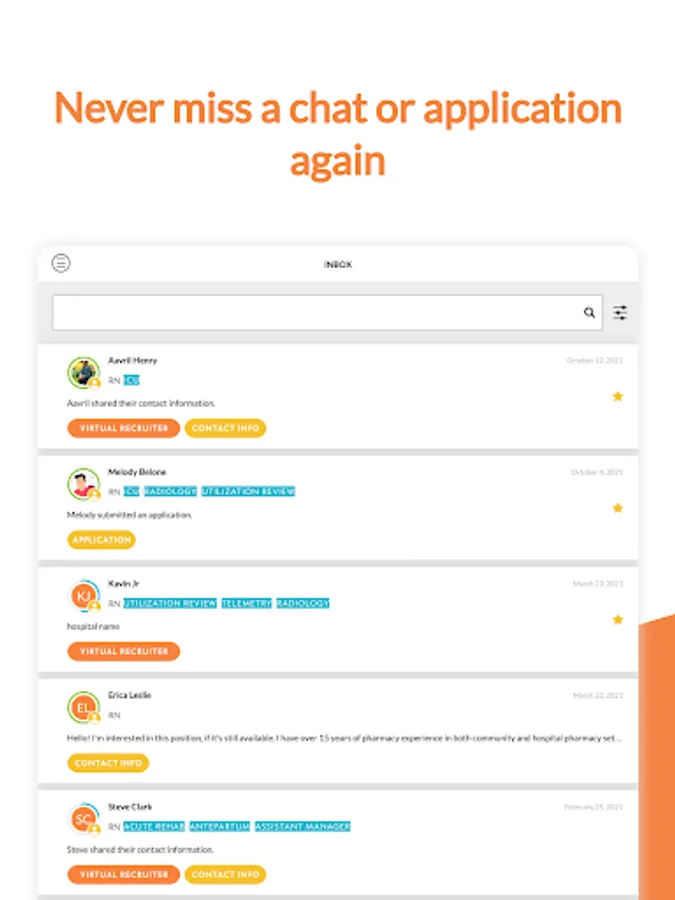 The inbox facilitates and organizes the recruiter’s clinician chats and applications.