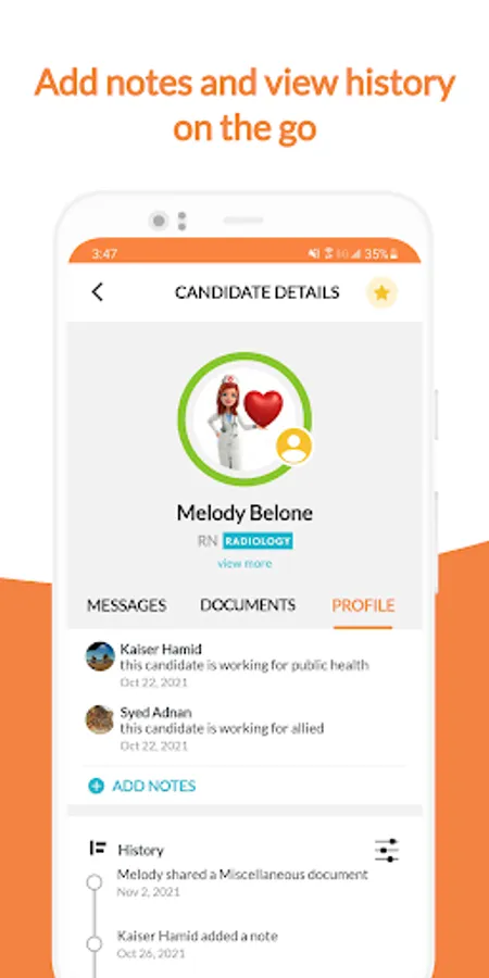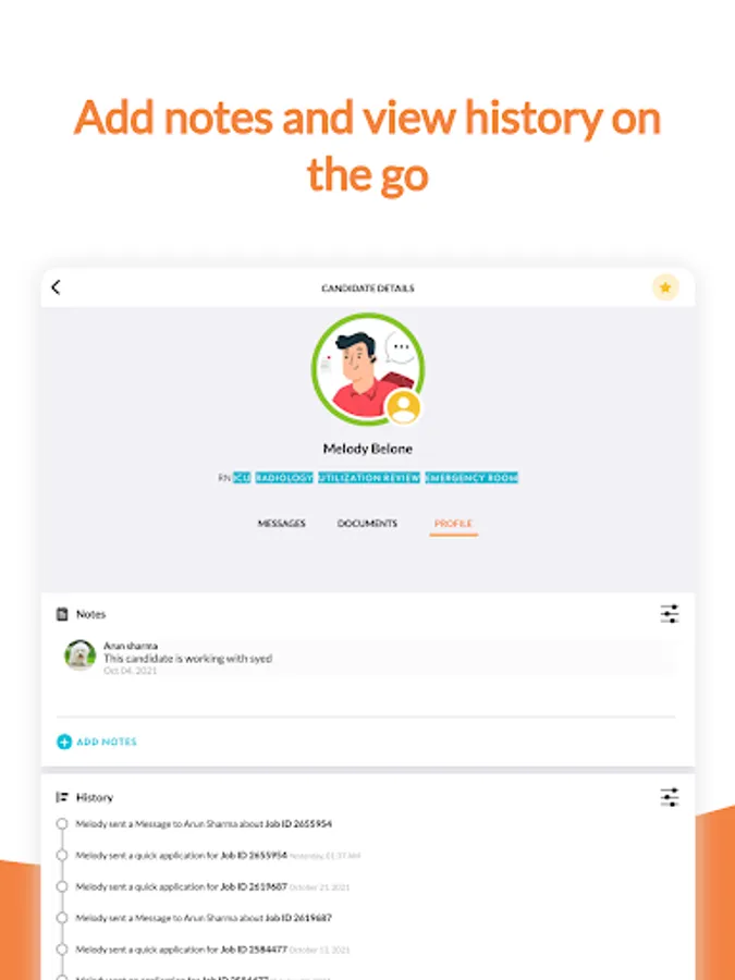 - Recruiters can communicate with others in their agency in the note section while seeing the complete history of each clinician application and chats with all recruiters in the agency.