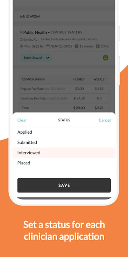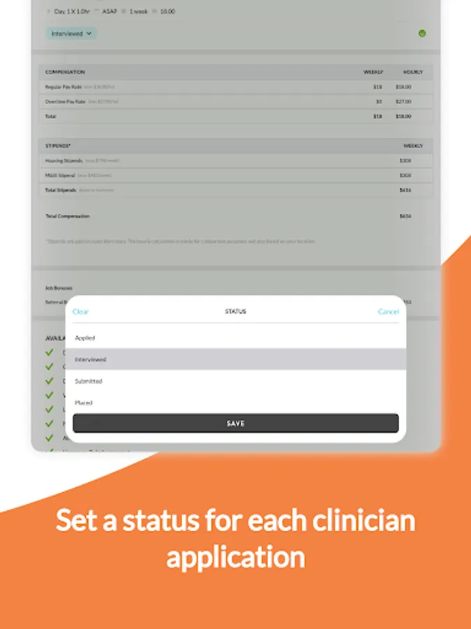- Recruiters can set a status for each clinician application based on submitted, applied, interviewed, placed to stay consistent.