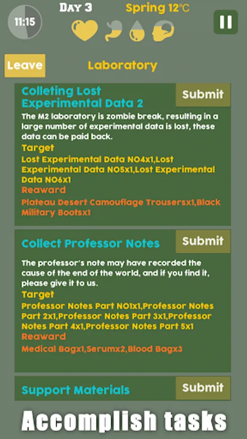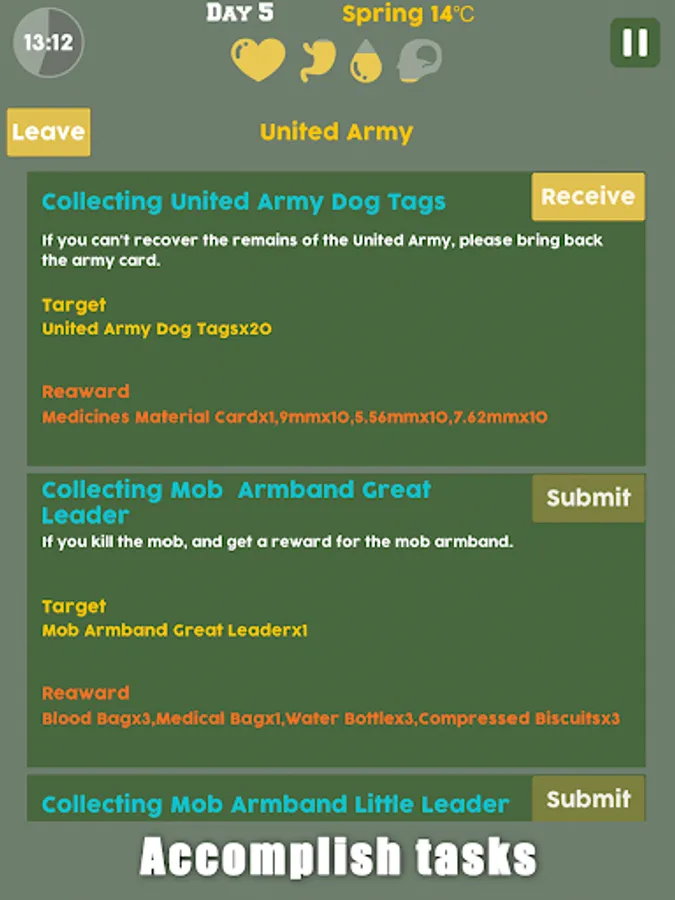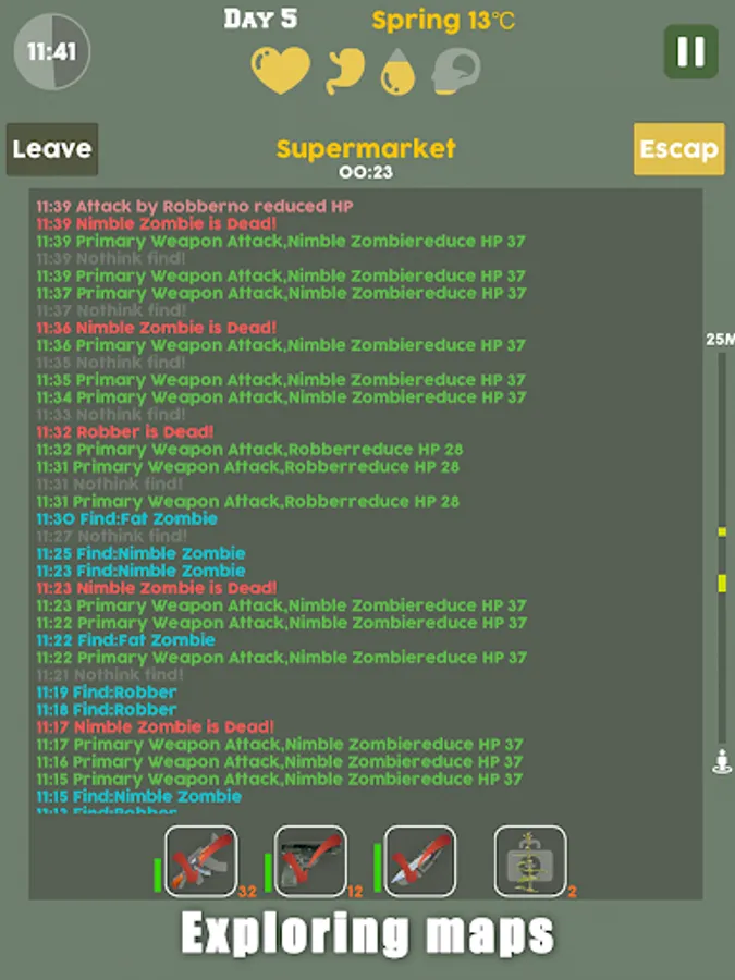 In the end, there are many factors that can threaten your life. Lack of food, lack of protection, lack of weapons and lack of drugs increase the difficulty of survival. Colds, fevers, poisoning, bleeding, weakness, dizziness, and other negative conditions can cause your death, and always maintain a state of spirit that can ward off many diseases.