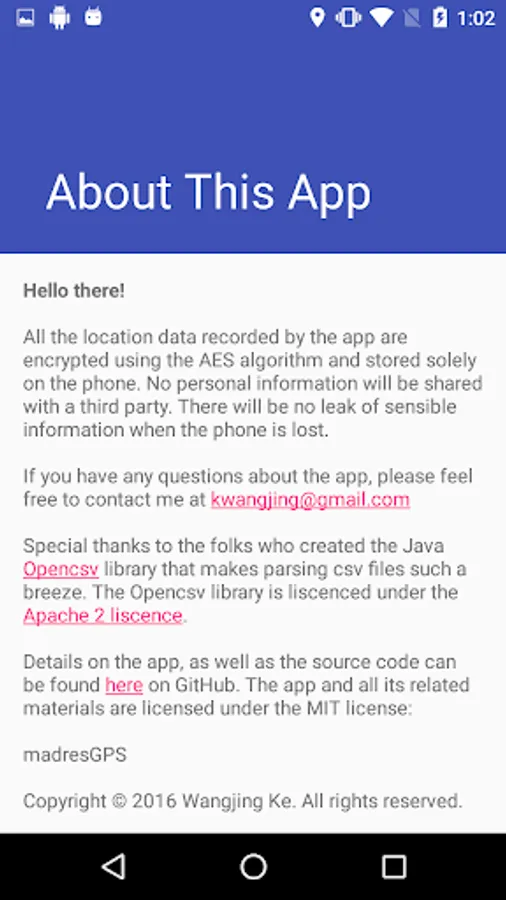 1. The location data is encrypted with the AES algorithm according to IRB requirements, so no sensible personal information will be leaked when the phone gets lost. The decryption of data can be easily implemented in all sorts of platforms, such as javascript, or java.