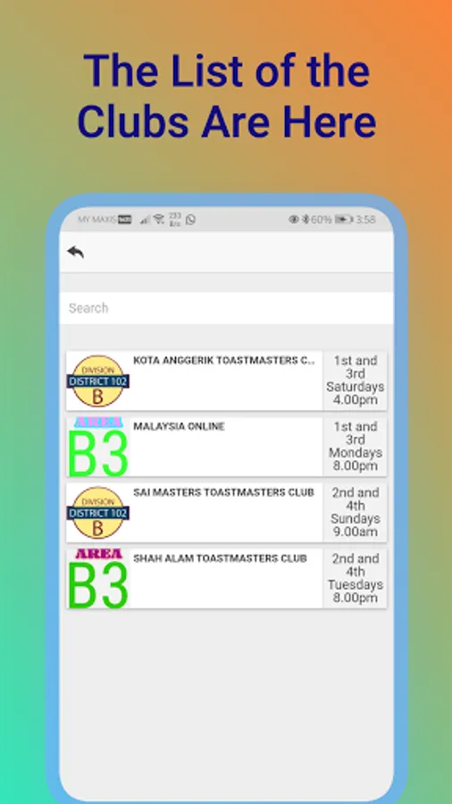 District 102 Division B is a simple directory mobile application mainly for anyone or everyone to search for clubs of Toast Masters which are located in the Division B of District 102.