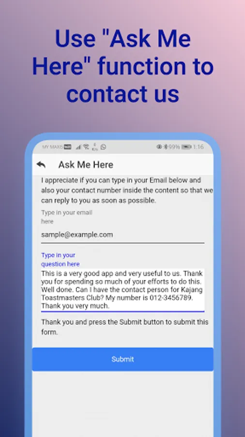 District 102 Division B mobile application also allow you to use the Function of “Ask Me Here” tab which is to let you send some questions or feedback to the developer. Users can use this function to ask for the contact numbers for the clubs that they found so that we can reply back to them for the contact person of the clubs.
