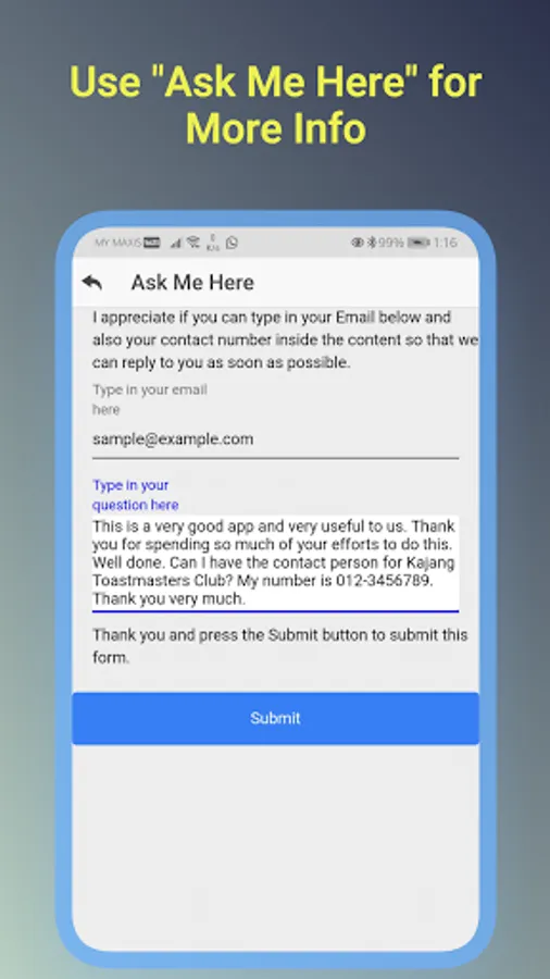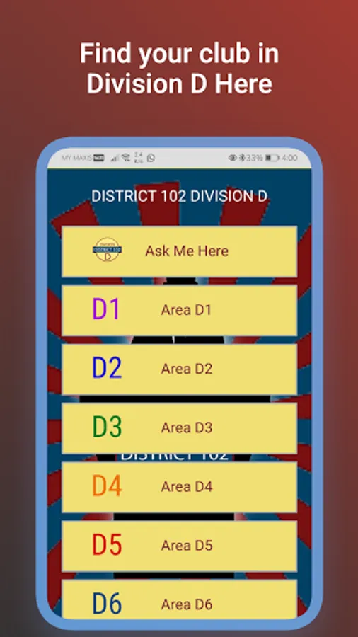 District 102 Division D mobile application also allow you to use the Function of “Ask Me Here” tab which is to let you send some questions or feedback to the developer. Users can use this function to ask for the contact numbers for the clubs that they found so that we can reply back to them for the contact person of the clubs.