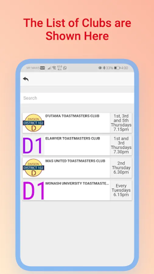 District 102 Division D is a simple directory mobile application mainly for anyone or everyone to search for clubs of Toast Masters which are located in the Division D of District 102.