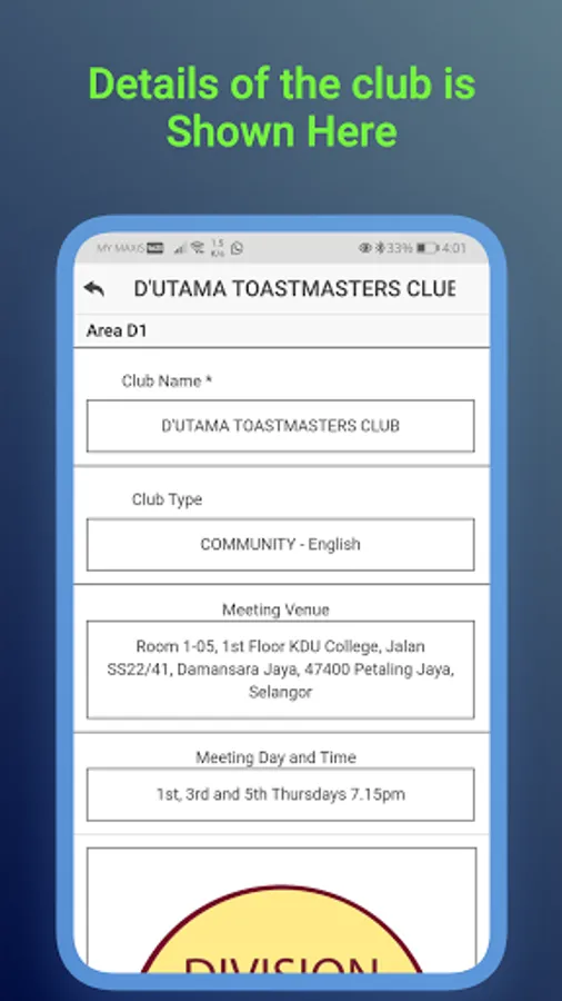 District 102 Division D allows you to know which clubs are in which Area in Division D and each club will displayed their Club Name, their Meeting Day and Time, their Club Type such as Community club or In-House club and in what language such as English, Mandarin, Bahasa Malaysia, Tamil or Bilingual and also their Meeting Address. However, at the time of writing this description now as in June 2021, most of the clubs are having the club meetings via virtual which mostly are using Zoom software.