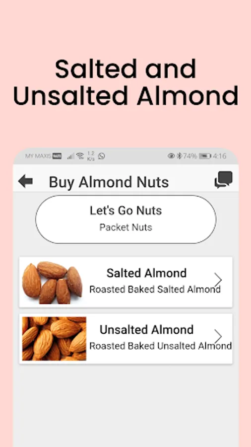 Let’s Go Nuts is selling Roasted Baked Almond Nuts. We have two types of Roasted Baked Almond Nuts and they are the Salted and Unsalted almond nuts. You can refer to the pictures inside this mobile application with all the details there.