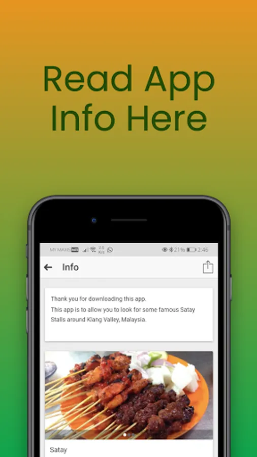 Try out this application and if you find this mobile application to be very useful to use and can benefit a lot of people including your friends, relatives, colleagues an enemies, please help to share this application to all of them so that they can be also able to use it to locate the satay barbeque stalls.