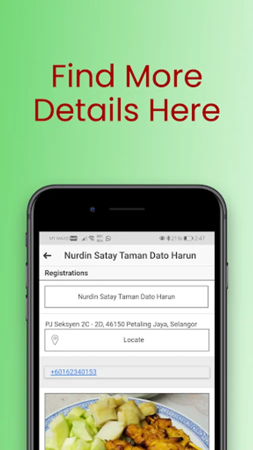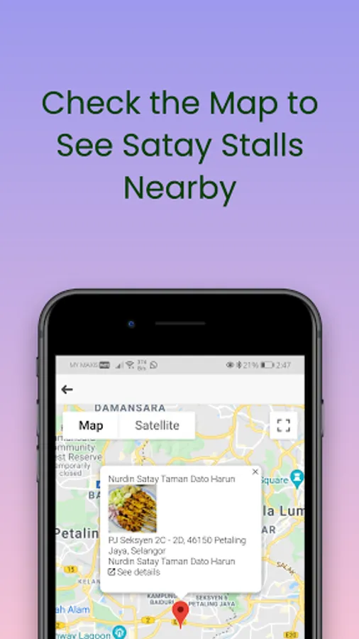 Satay Stalls in Klang Valley let you see inside the google map the location of the satay stalls with the stall names, the address of the stall and more details that you can see later in the details tab.