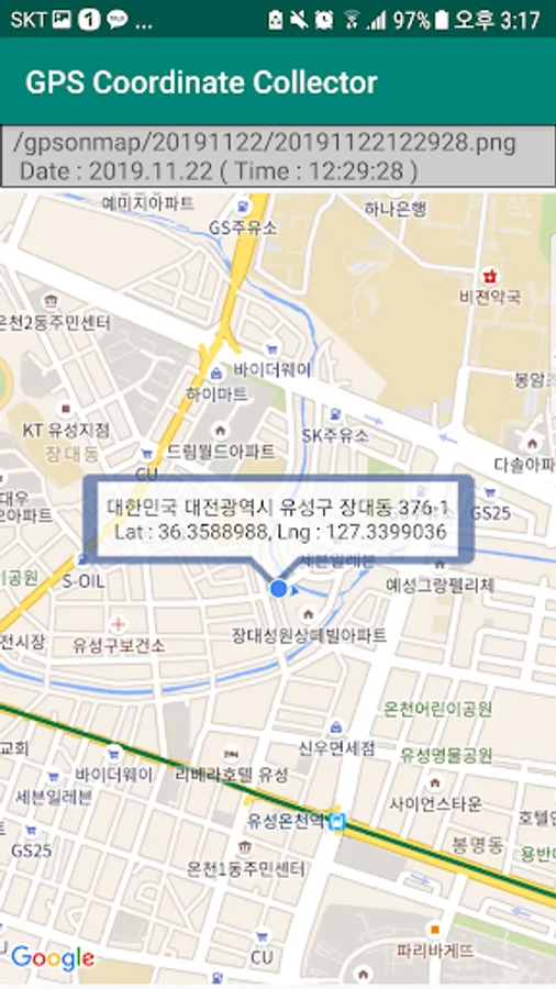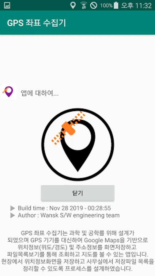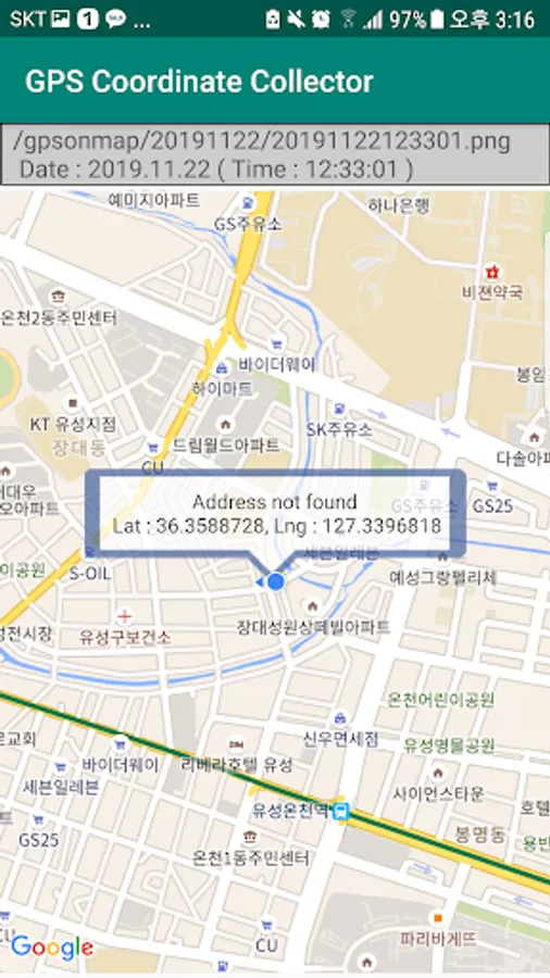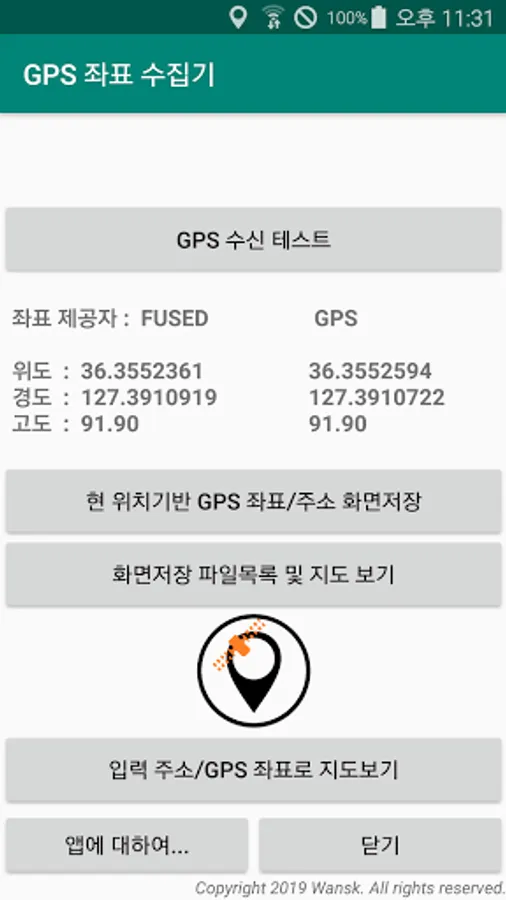It is an app that can replace GPS devices and save location information (latitude/longitude) as a screenshot, inquire through a file explorer, and view and check screenshot images.