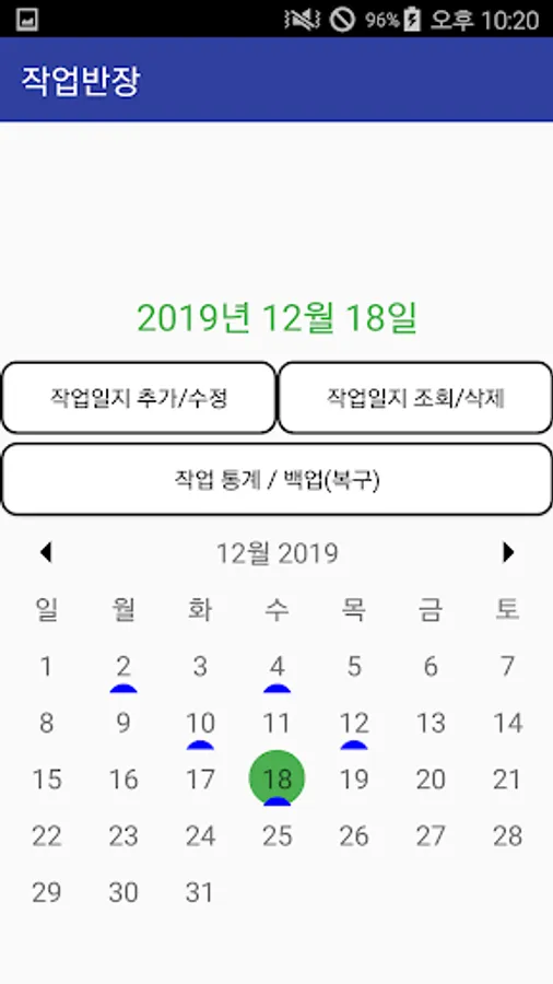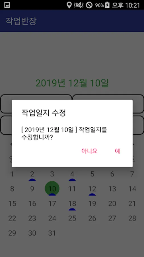 You can add or modify a work log by clicking the relevant date on the main screen (calendar screen) and clicking the "Add/Edit Work Log" button.
