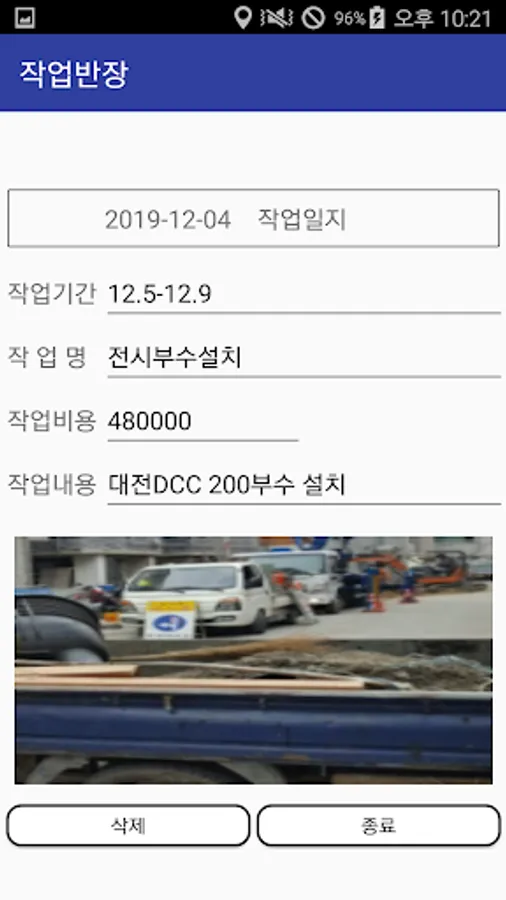 Click the relevant date on the main screen (calendar screen) and click the "View/Delete work log" button to view or delete the work log in detail, and enlarge the photo.
