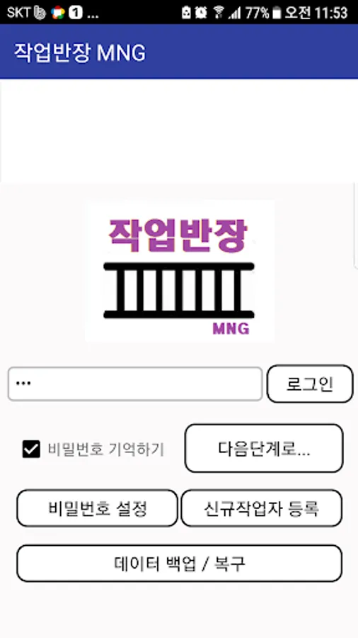 This is a screen to save basic information for password login when the app is launched. Basic input items can be saved by entering the user's name, password, password confirmation, and mobile phone number.