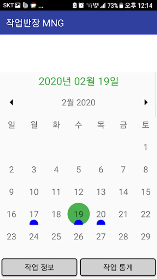 On the main screen (calendar screen), if there is a blue semicircle on the date, it means that the job information is stored. If there is no indication on the date, the job information is not saved.