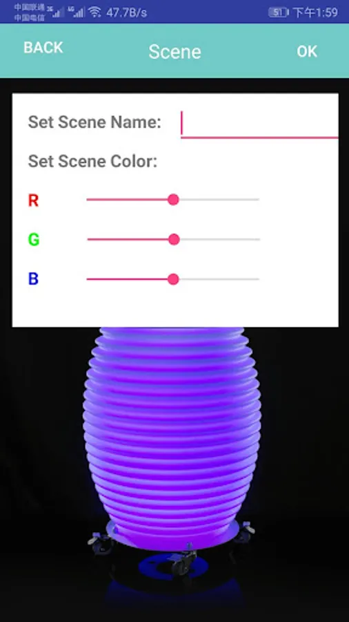 (2) lighting adjustment. There is an RGB color palette in the middle of the page. After the BLE bluetooth connection is successful, touch the color palette to adjust the color of the light. Scene mode, you can save the RGB value of a certain light and continue to use it next time.