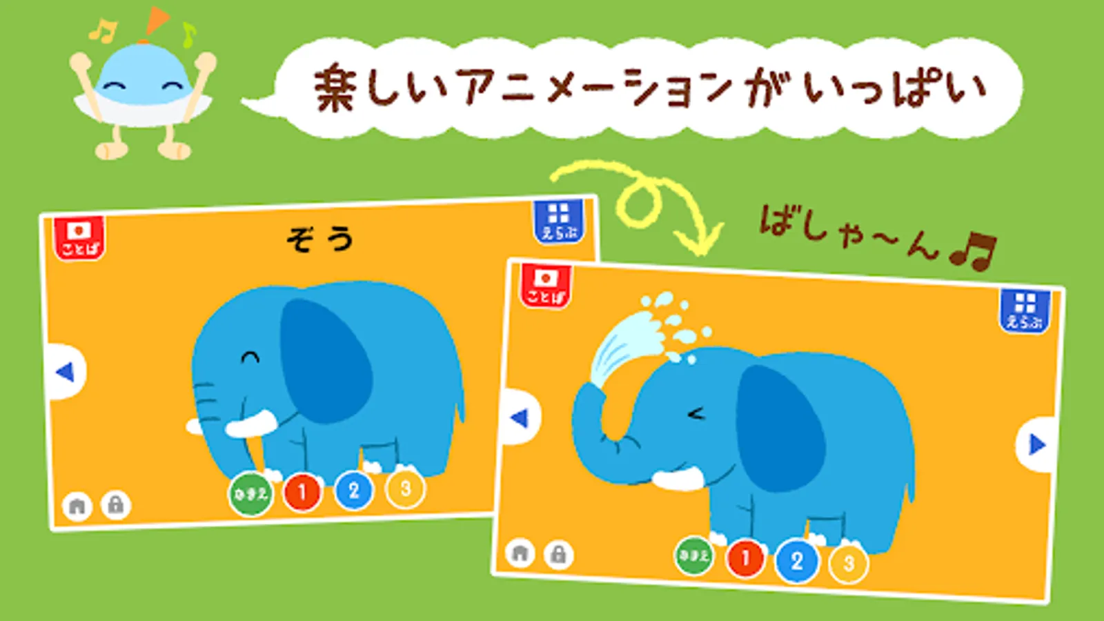 While touching with your child, while watching the names of the things that appear such as "elephant" and "densha" and the screen animation together, please gently say "it looks good" and "it moved fast". ..