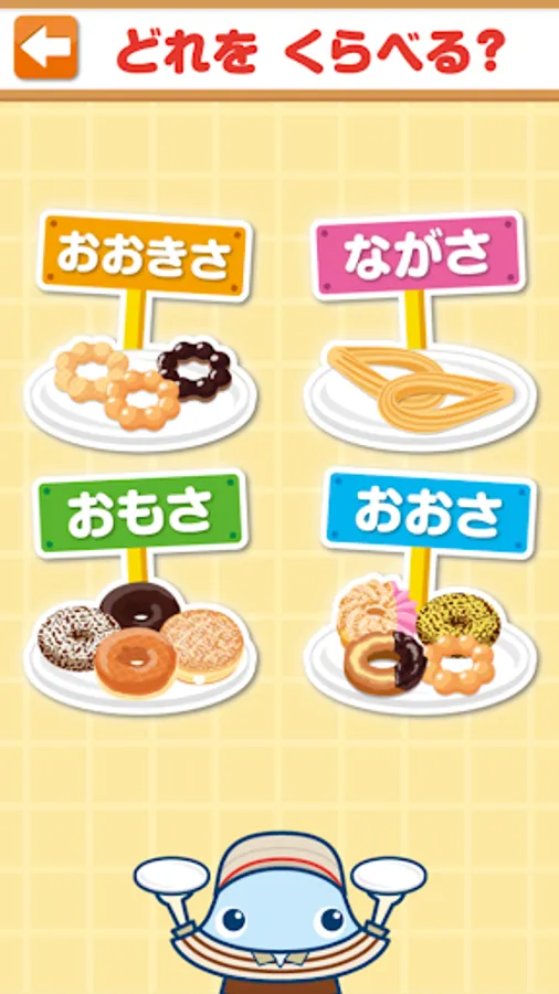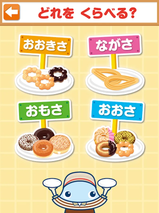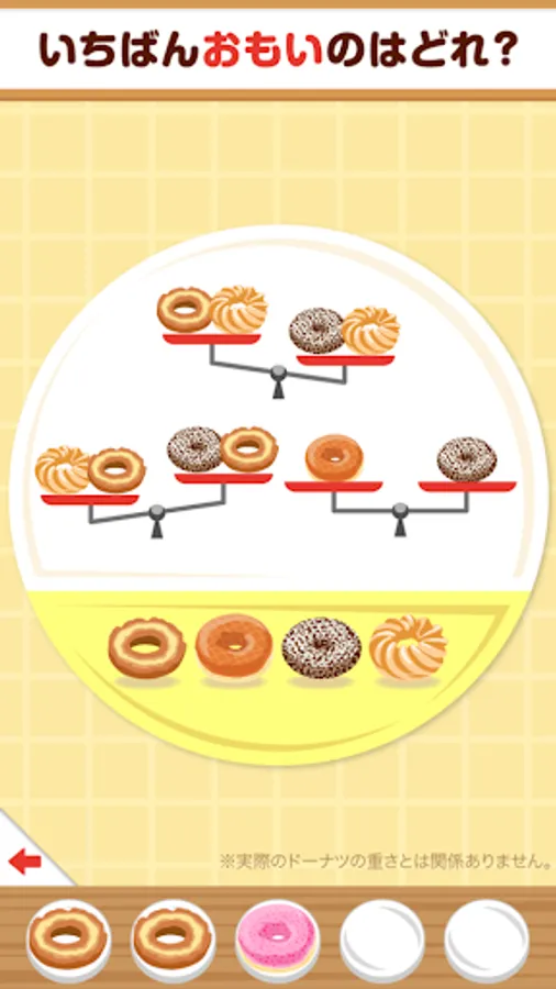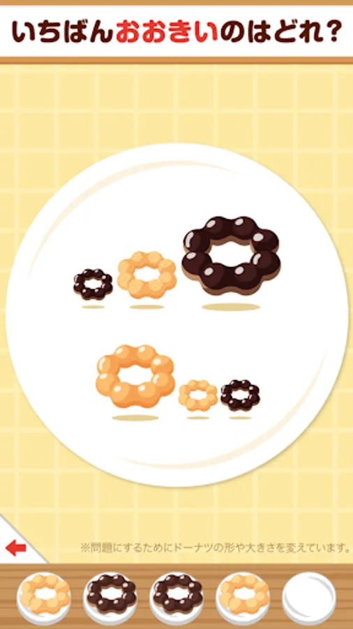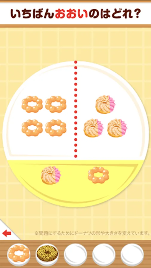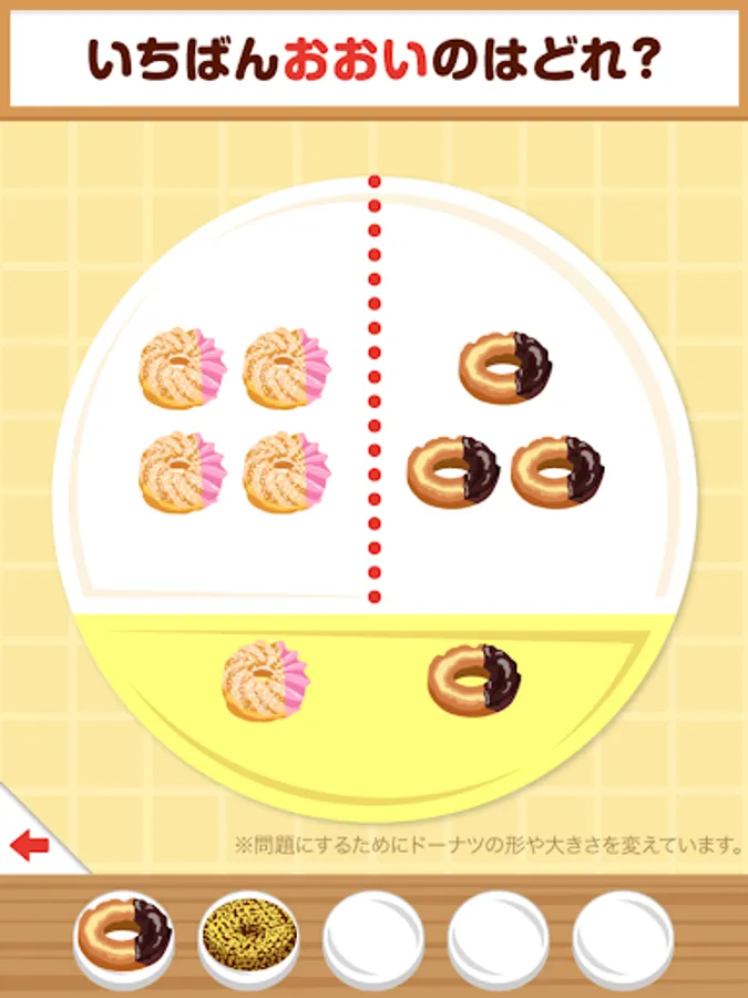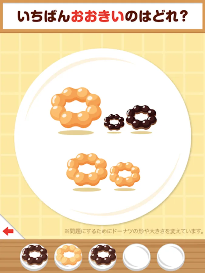 Next, look for the largest or the longest among the many. It is set to be naturally difficult when the orientation or color changes, or the arrangement changes, but it will be fun to keep the delicious donut illustrations intuitively manipulated in the teaching materials.