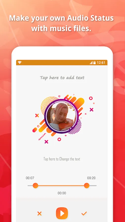 Have you ever wished that you could easily post that part of a song or audio that you think is amazing. Well Audio Status Maker lets you do just that. With Audio Status Maker you can pick any audio from your library or even record yourself if you wish, trim the audio to pick just that part that you want to share and convert it to an audio status choosing one among several vibrant backgrounds available in the app. You can share this status on WhatsApp or any other social media platform and it will work! try it.