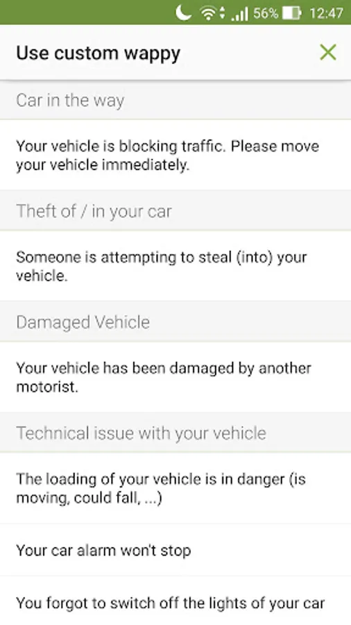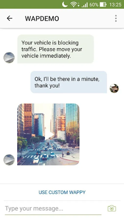 You can compose your own message or use ready-made wappies for different possible situations, add a photo or video and send them with a few very quick steps.
