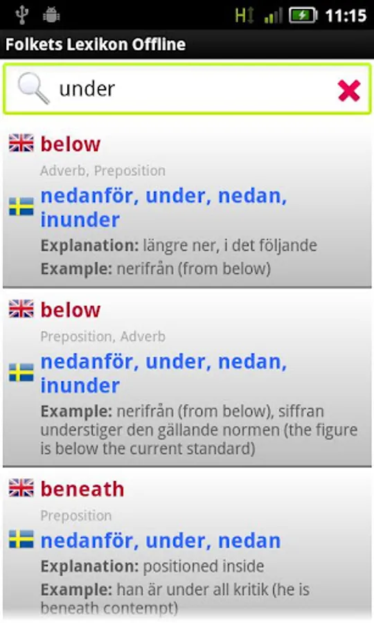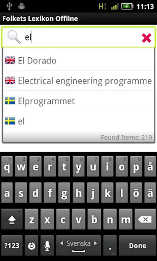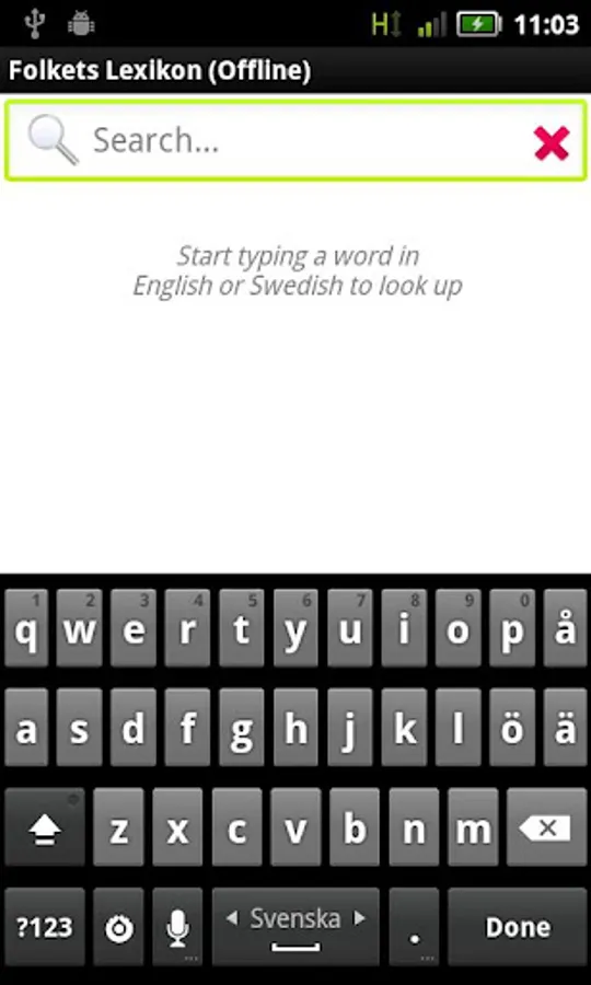 Here's a completely offline Swedish-English / English-Swedish dictionary based on Folkets Lexikon (http://folkets-lexikon.csc.kth.se/folkets/) with more than 46,000 English and 89,000 Swedish entries. It incorporates around 12000 examples, 8000 explanations, 16000 grammatical hints and 4500 idioms, so it offers maximum possible help while you're learning English or Swedish.