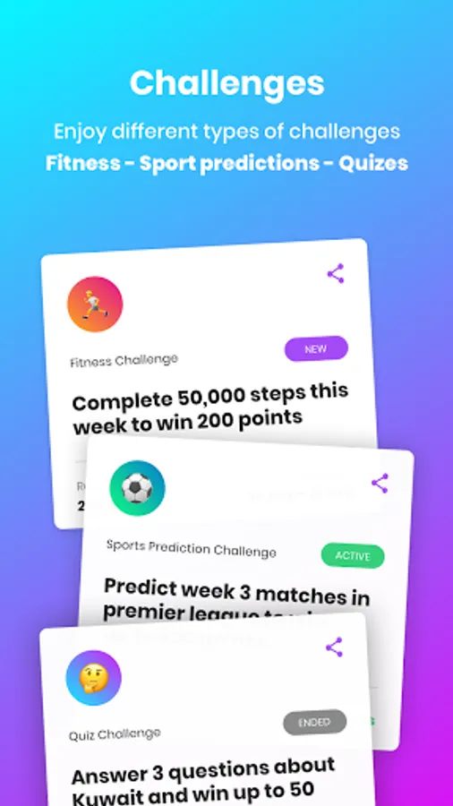 • Join a variety of Challenge from Football predictions, Quizzes and Exclusives to earn points for free.