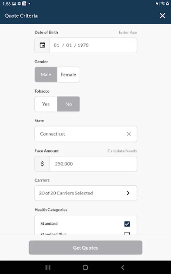 This completely free app delivers quote comparisons for over 30 life insurance carriers. Quotes are given for all 50 States. Are you a life insurance agent? Sign up for a free account to use powerful agent tools.