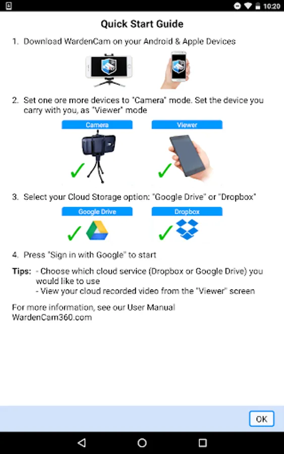 Getting Started: Install the Free WardenCam App on your phone and your spare android devices. In the App, set your spare device to "Camera" mode, sign in with your Google Account, and place your device where you want to watch. In your phone's WardenCam App, set it to "Viewer" Mode, sign in with the same Google Account, and that’s it! Please Log in with the same Google account, that's how the 2 devices can find each other. You are now connected to your loved ones. With WardenCam's motion detection feature and Google Drive and Dropbox integration, you can enjoy peace of mind without keeping a constant eye on things.