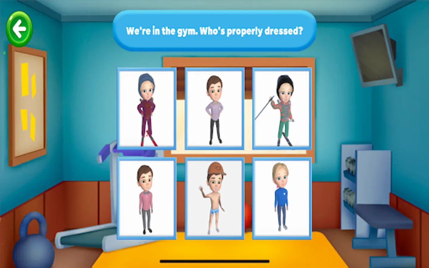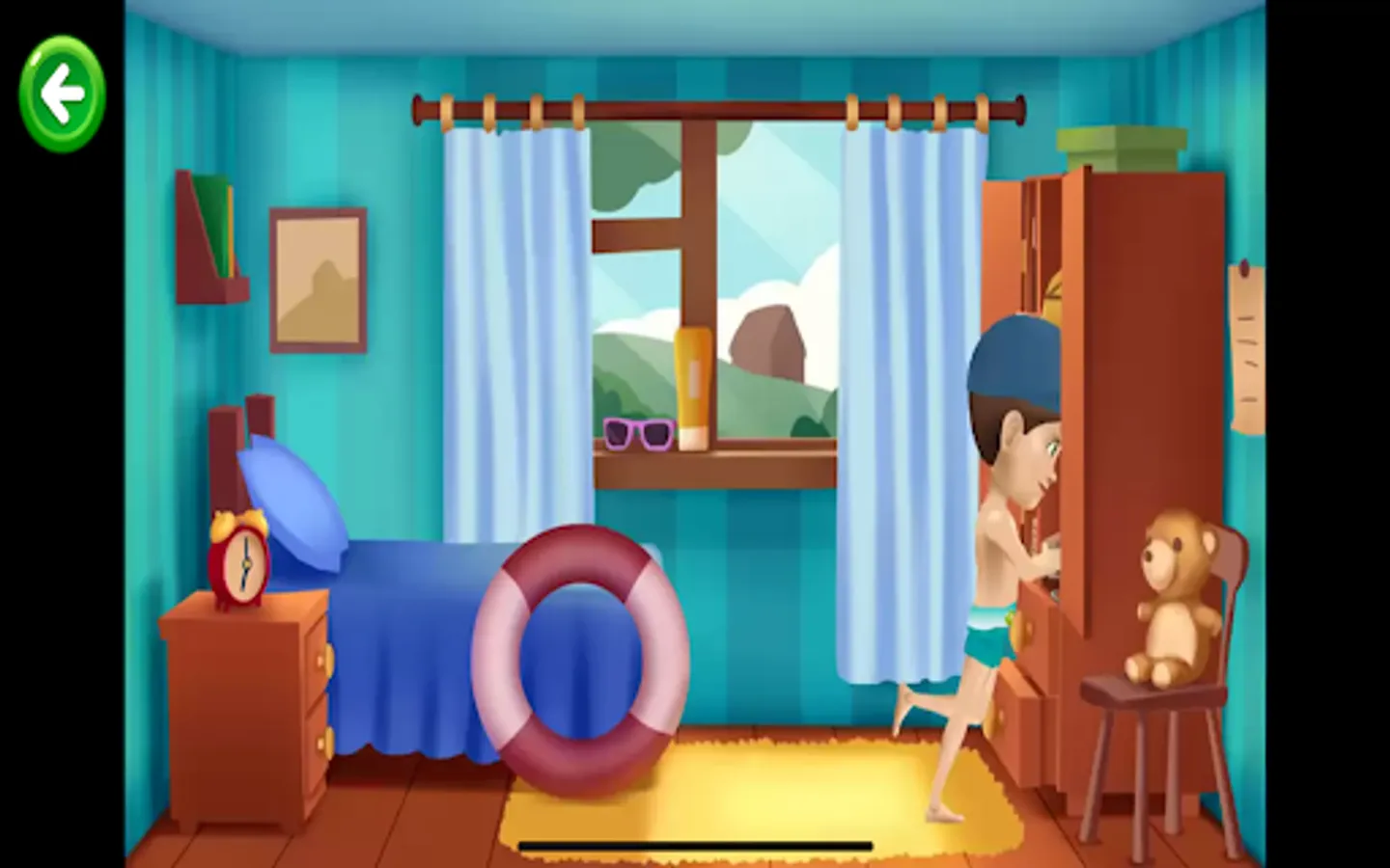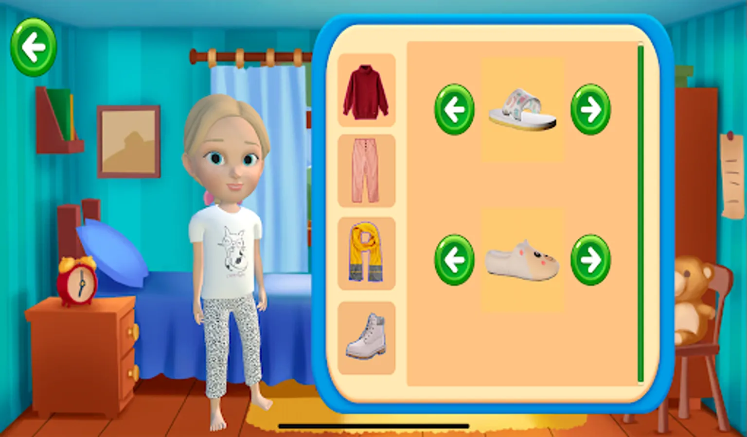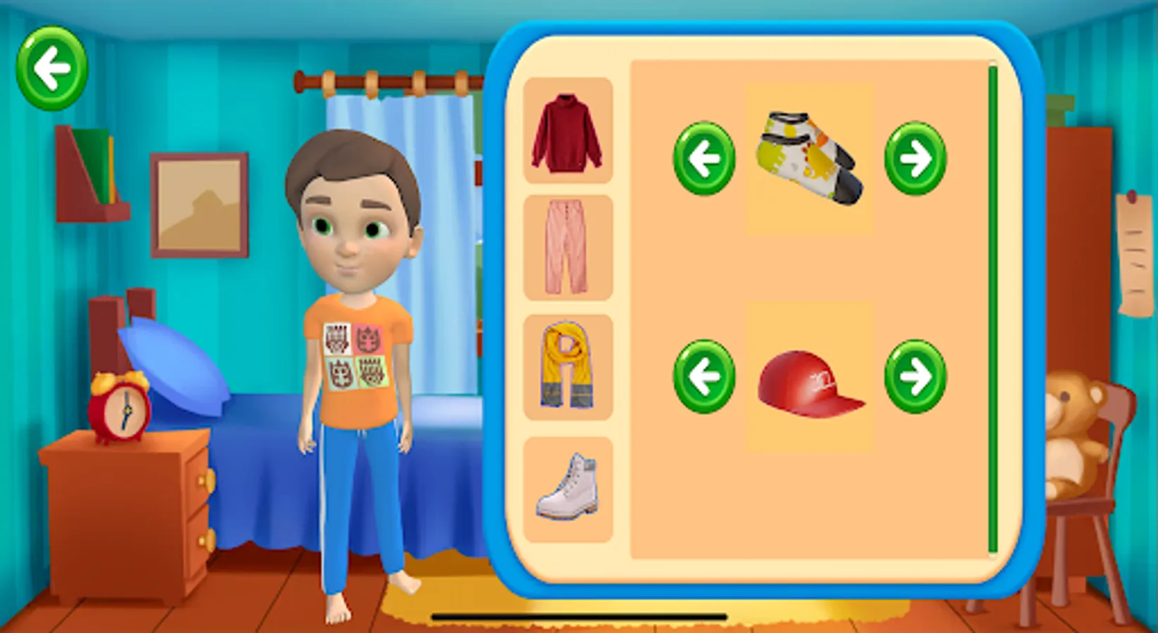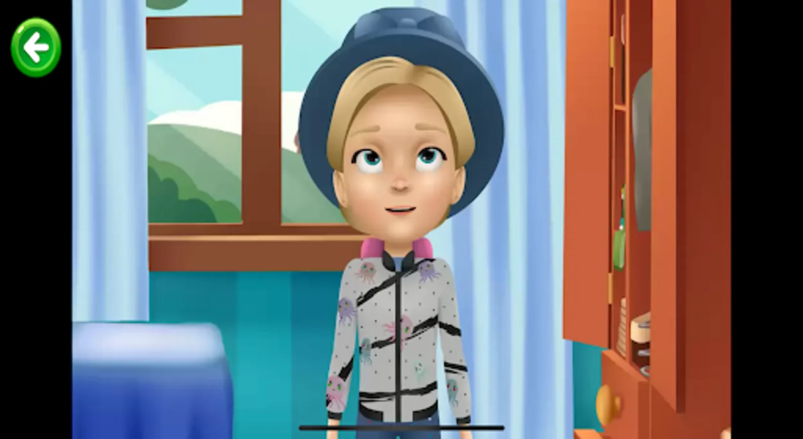 ○ Going for a walk exercise. It is advisable to play this game right before leaving the house. The character and child will dress together. They will need to choose the clothing items in the correct order that correspond with the season.
