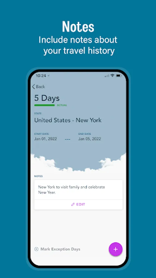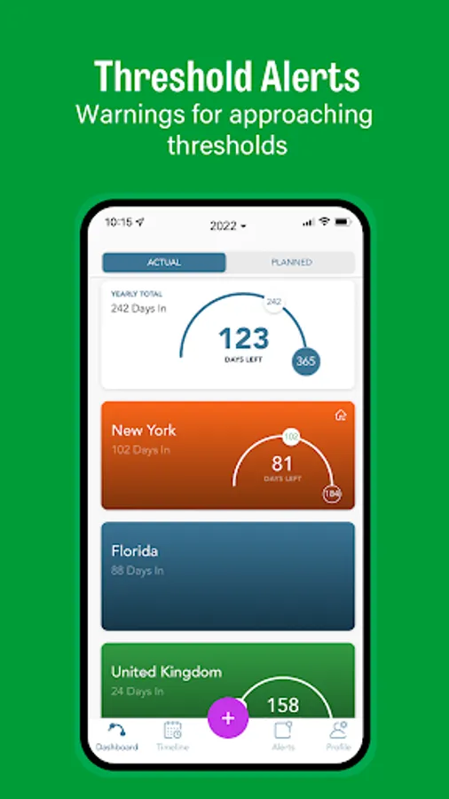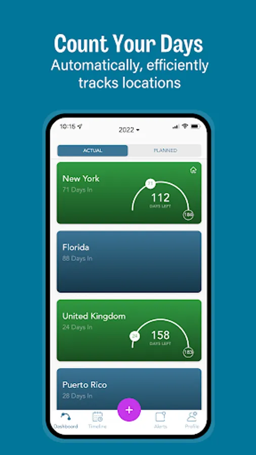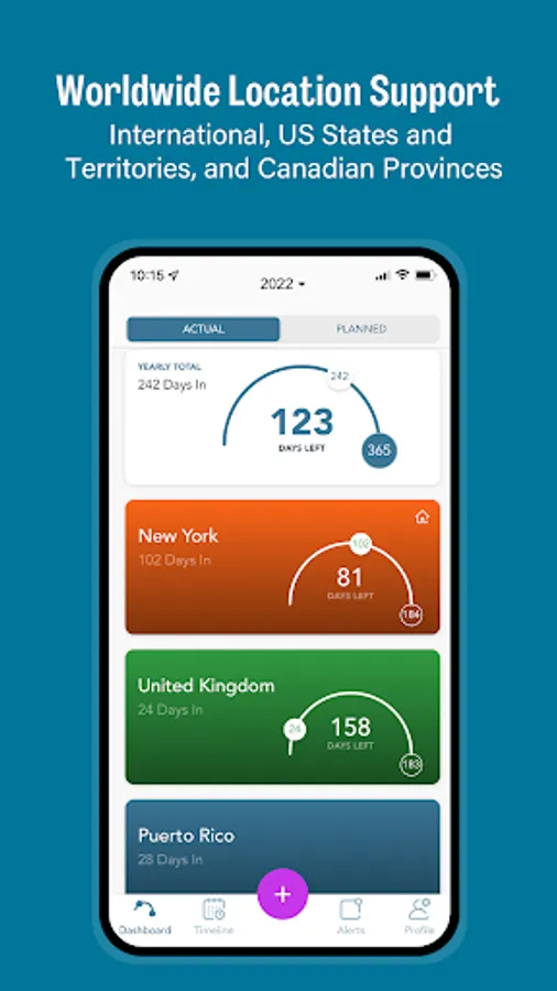 Stop worrying about tracking days for tax residency! TaxBird lets you easily track how you spend your days throughout the year with support for country-level tracking worldwide, state-level tracking in the US, and province-level tracking in Canada. At year-end, download your summary to support your residency status. Real-time tracking runs in the background using your phone's location services, showing how many days you've spent in each location, and how many days you have left before reaching a residency threshold.