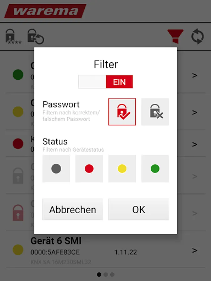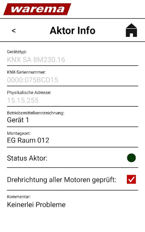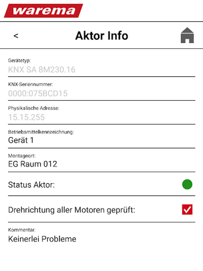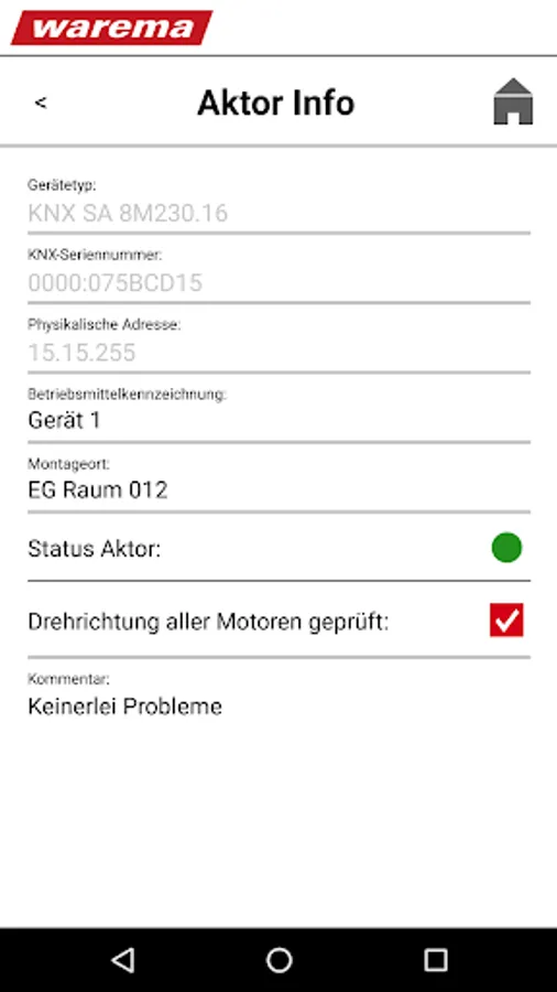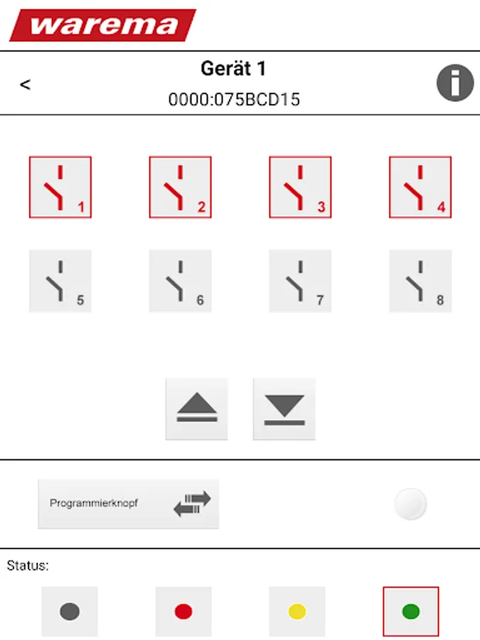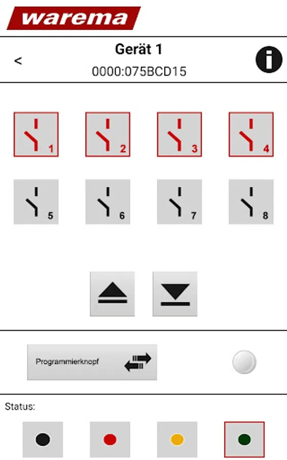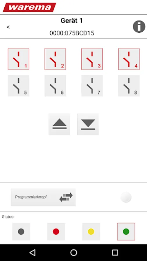 The app serves as a commissioning aid for the WAREMA KNX SA surface-mounted actuators. It allows manual override operation via smartphone (Bluetooth LE), the status display of the binary inputs and the actuation of the programming button on the KNX actuator.