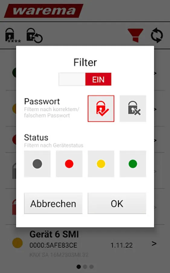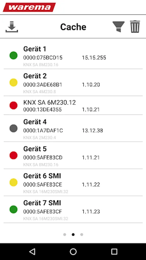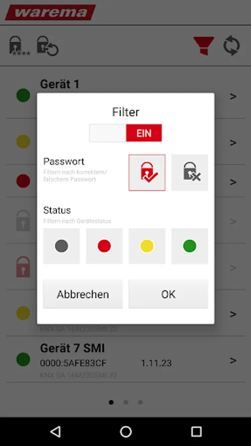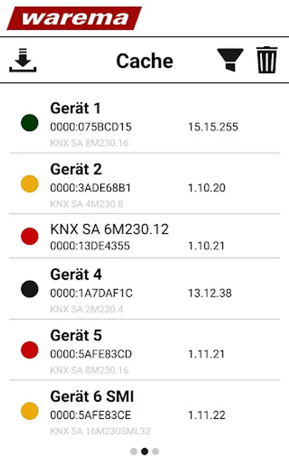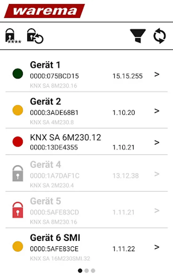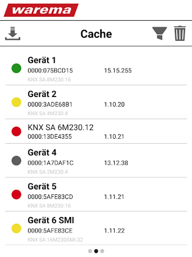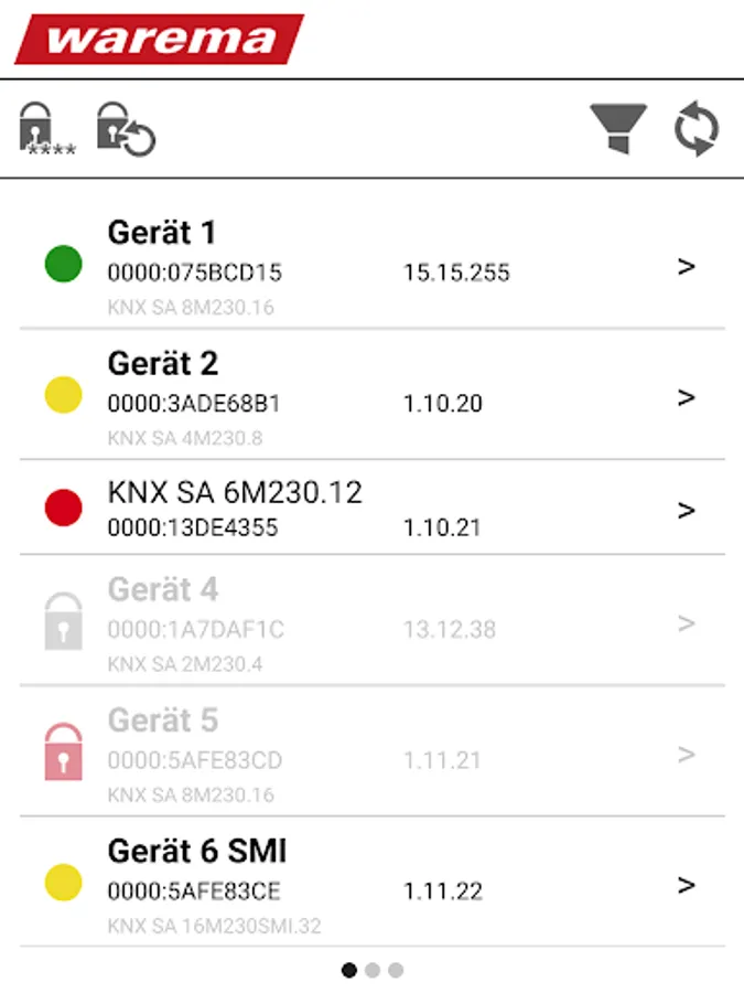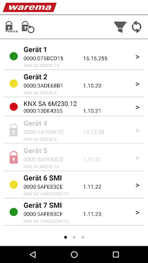 The app serves as a commissioning aid for the WAREMA KNX SA surface-mounted actuators. It allows manual override operation via smartphone (Bluetooth LE), the status display of the binary inputs and the actuation of the programming button on the KNX actuator.