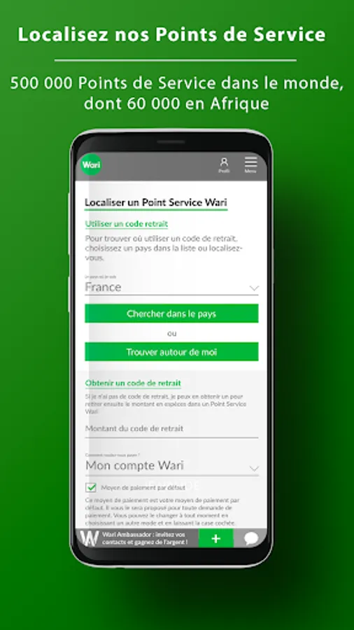 With or without a Wari Account, myWari allows you to perform all your financial or commercial transactions, daily.