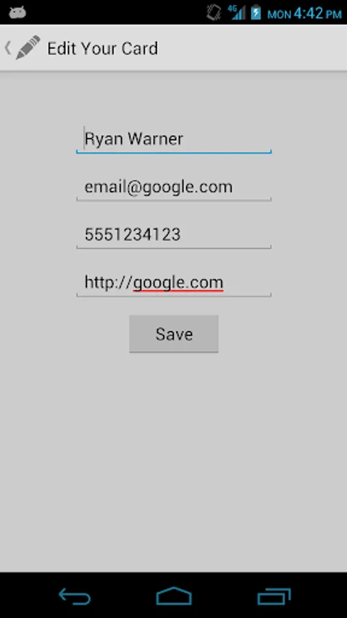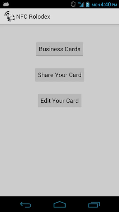 NFC Rolodex is an application used to swap virtual business cards with one another. Demonstrating the use of NFC technology you can enter in information about yourself and exchange it with someone else who has the same app.