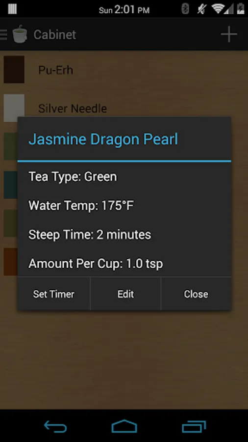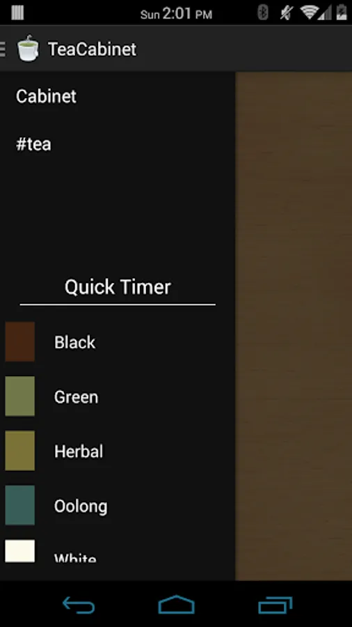TeaCabinet is made for use alongside your personal tea cabinet or storage of teas. It's an easy to use, organized, and social way to enjoy your teas. My objective was to make an easy to use interface for storing information about your personal tea collection. You are also able to set timers for a default standard of teas or set one for your own cabinet.