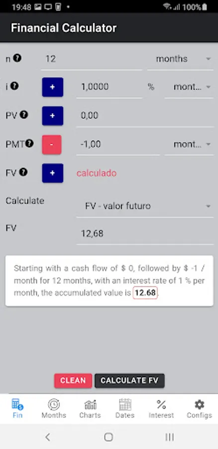 Financial Calculator Free can be used by anyone without any training. It is similar to HP 12C and can calculate dates, convert interest as well as calculate: presente value (PV), future value (FV), payment (PMT), number of periods (n), interest rate (i). It shows the cash flow as the most advanced finance calculators. You can start calculating without reading any manual (opposite of HP 12C) and without spending any money, because it is free.