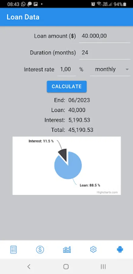 With an easy-to-use interface, the application can be used to view the amount of installments and the total interest paid.