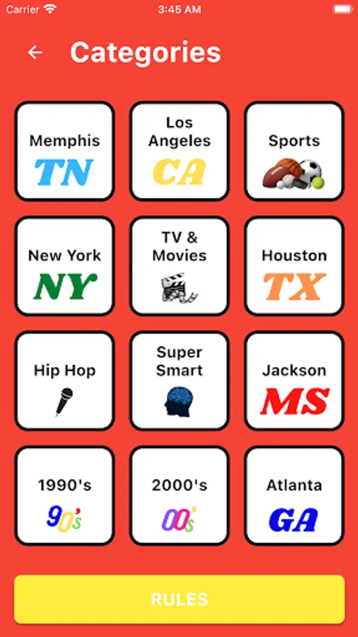 It consists of 12 categories and over 5,000 fun questions! Categories include: Sports, TV, Movies, Brain Teasers, 1990's culture, 2000's culture, Atlanta, Los Angeles, New York and other popular U.S. cities!