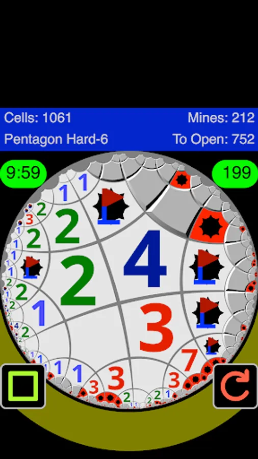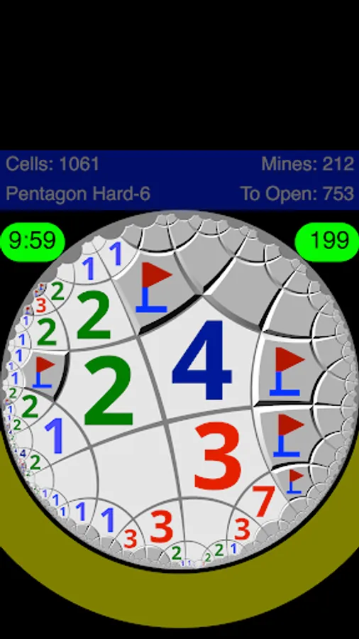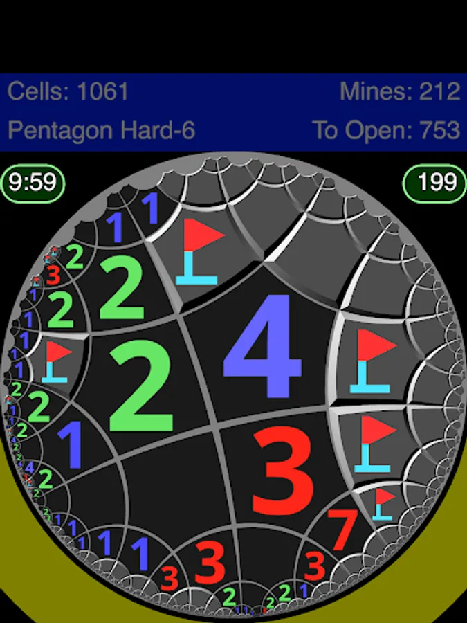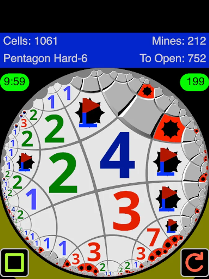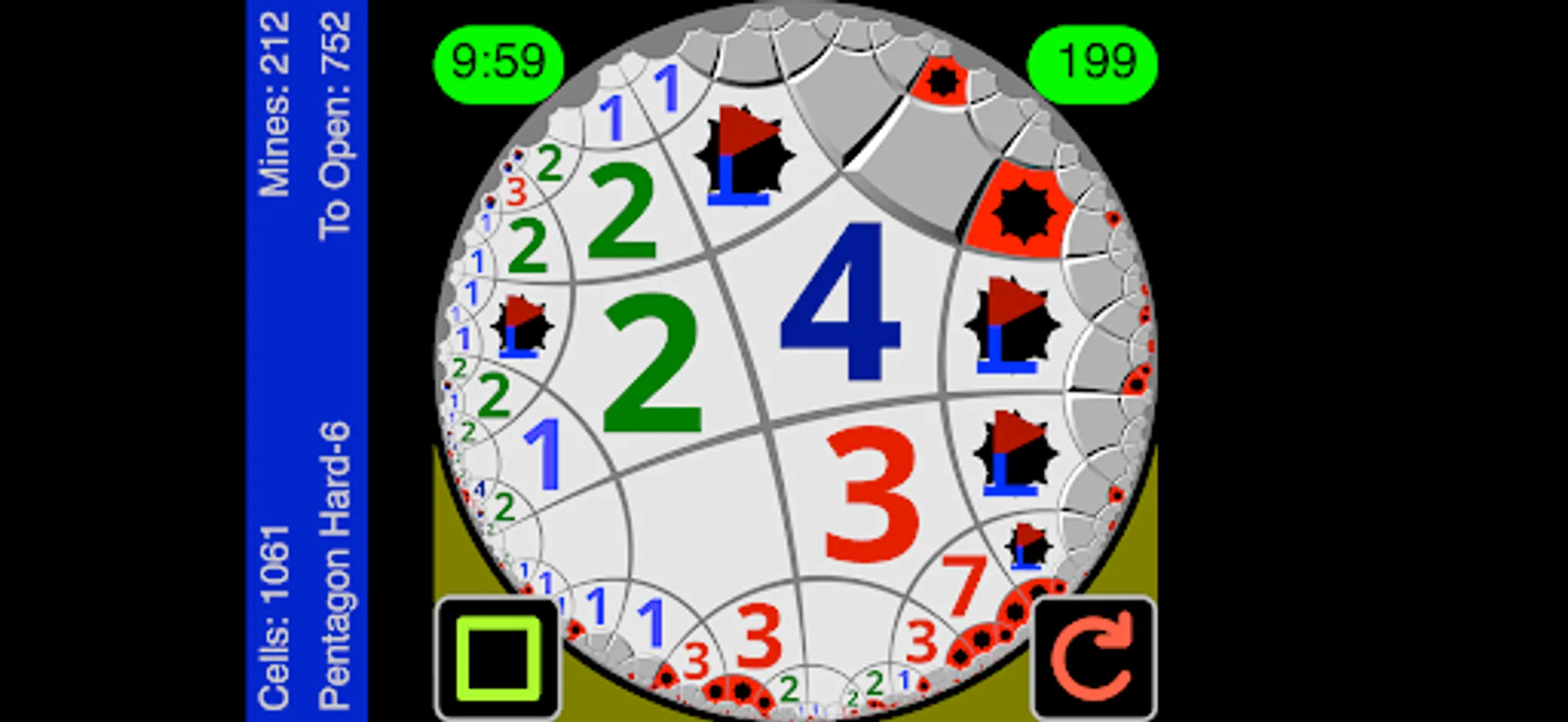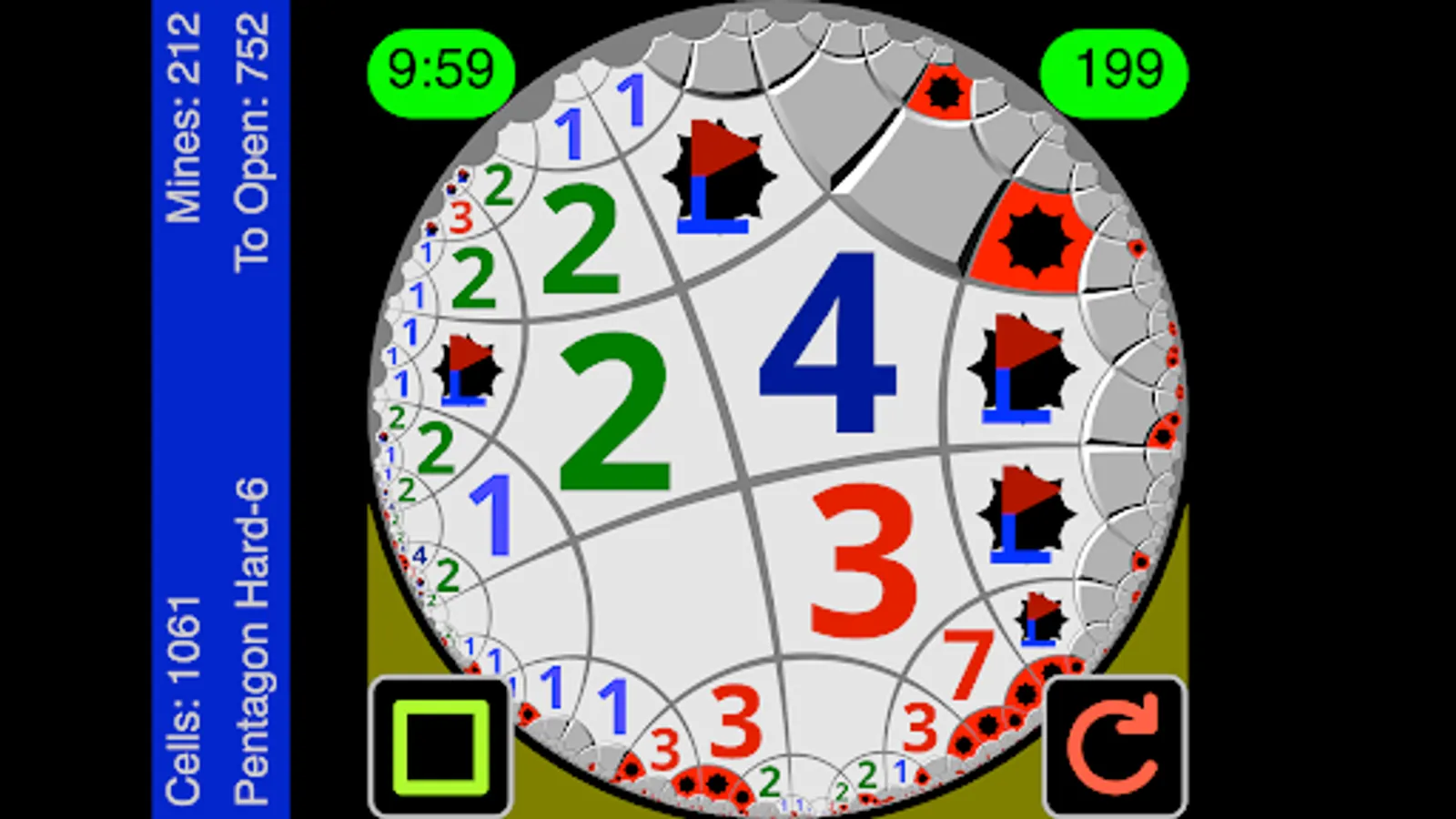 The game goal is to find out the locations of mines. Drag the circular playing field and tap cells to open them. If you open all cells that have no mine, you win. Hitting a mine by mistake, you lose the game.