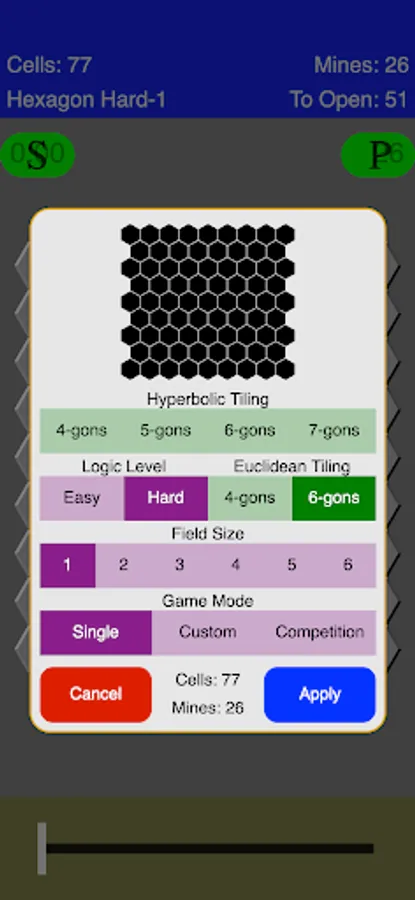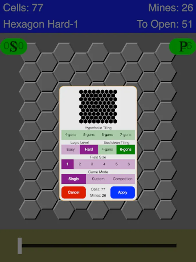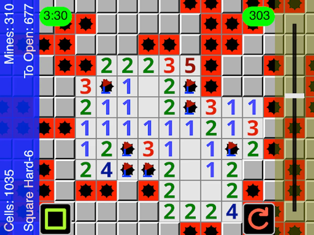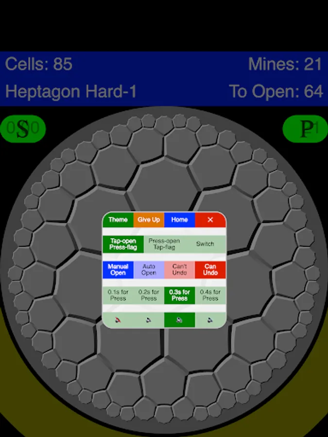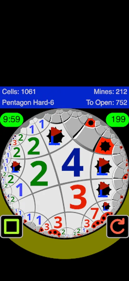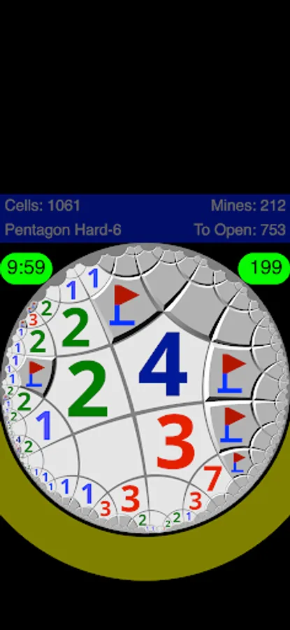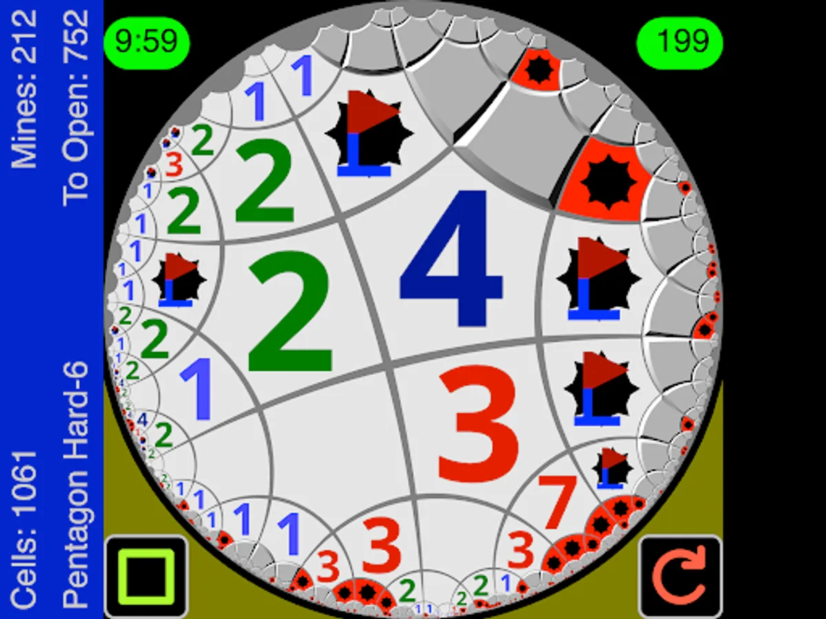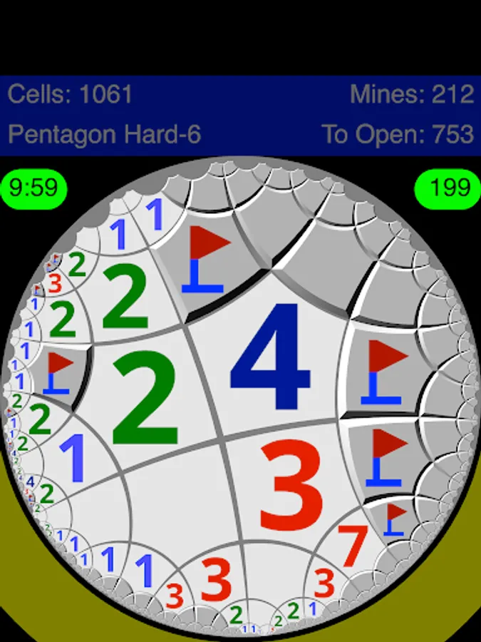 The game goal is to find out the locations of mines. Drag the circular playing field and tap cells to open them. If you open all cells that have no mine, you win. Hitting a mine by mistake, you lose the game.