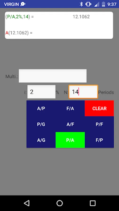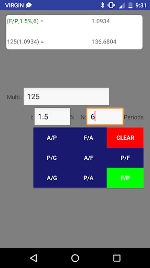 This program allows you to calculate common economic factors encountered in engineering economics courses. To calculate the value of a factor, you need to input an interest rate and period as well as choosing the desired type of factor. The top equation displays the calculated factor value. The bottom equation displays the product of this factor value and its multiplier.