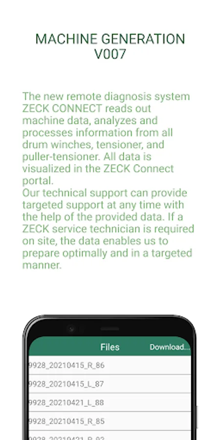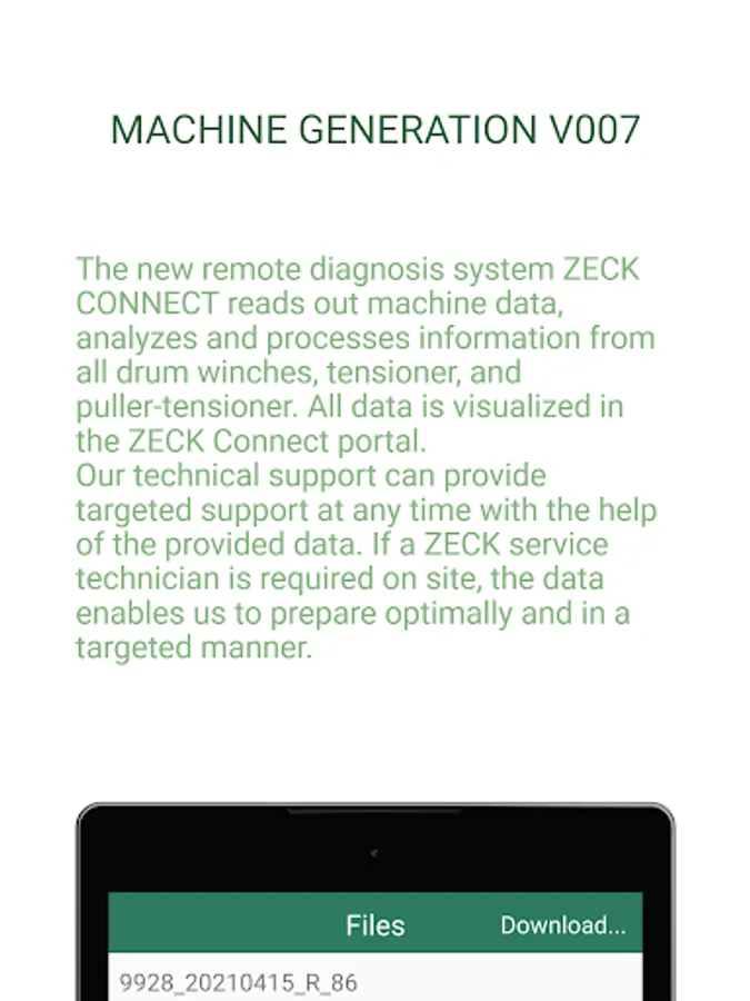 The new remote diagnosis system ZECK CONNECT reads out machine data, analyzes and processes information from all drum winches, tensioner, and puller-tensioner. All data is visualized in the ZECK Connect portal.